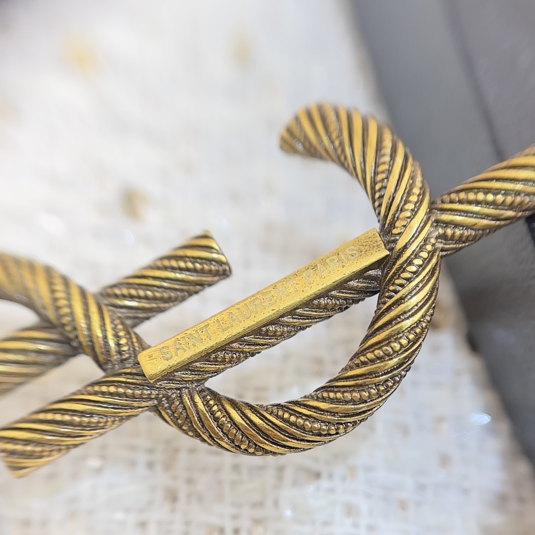 antique Saint Laurent Gold YSL Brooch - Elevate your style with the timeless elegance of the Saint Laurent Antique Gold YSL Brooch. This exquisite piece is more than just an accessory; it's a statement of sophistication and a nod to iconic design. Crafted with meticulous attention to detail, the brooch features the signature YSL logo in a stunning antique gold finish, adding a touch of vintage charm to any outfit. The Saint Laurent Antique Gold YSL Brooch is a versatile addition to your wardrobe, perfect for accentuating a blazer, dress, or even a simple scarf.