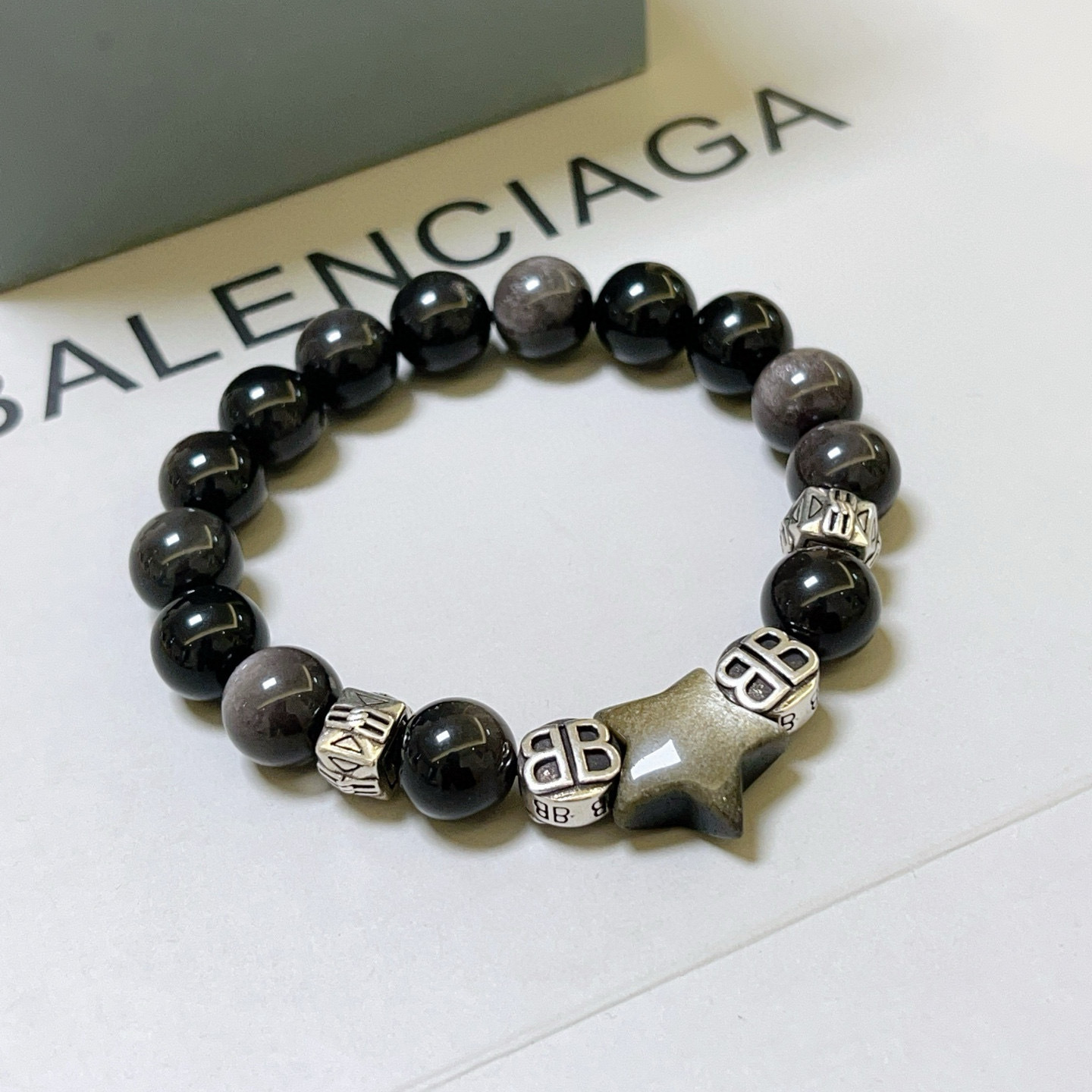 Balenciaga Black Obsidian Bracelet - Star & BB Charm