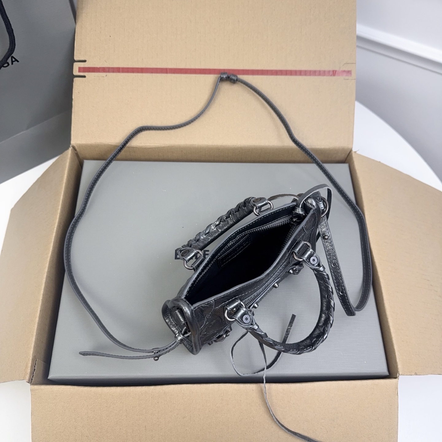 The attention to detail in this Balenciaga bag is evident in every stitch. The hardware is carefully selected to complement the black leather, adding a touch of elegance. The interior is lined with a soft fabric to protect your belongings, and there are pockets to help you stay organized. This mini bag is a true testament to Balenciaga's commitment to quality and style.