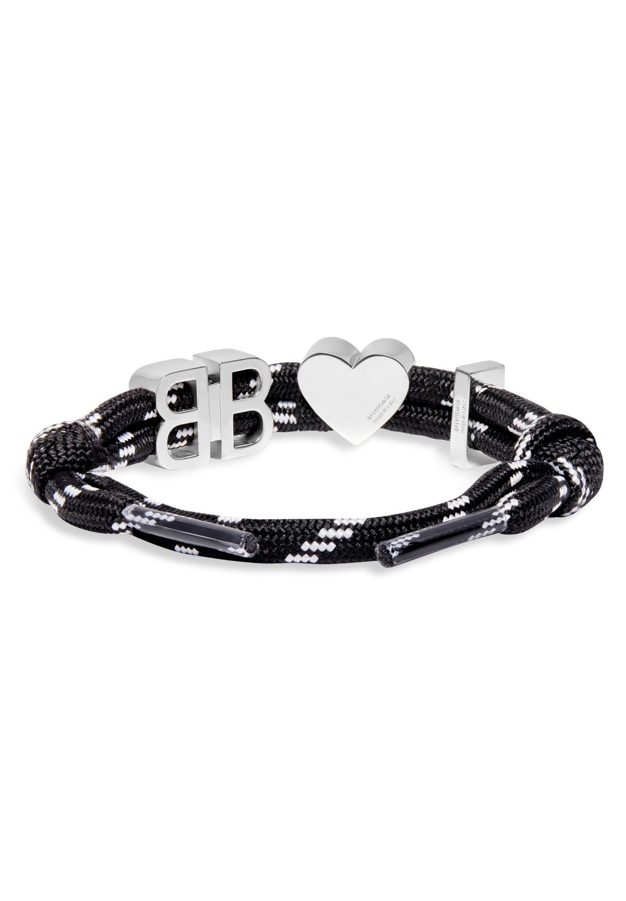 The bracelet is crafted from a durable black and white patterned cord, providing a comfortable yet stylish fit. The silver-tone accents, including the heart charm, 'BB' logo, and 'Balenciaga' inscription, are made from high-quality metal, ensuring longevity and a polished finish. The contrast between the rugged cord and the sleek silver elements creates a visually striking piece that is both modern and timeless.