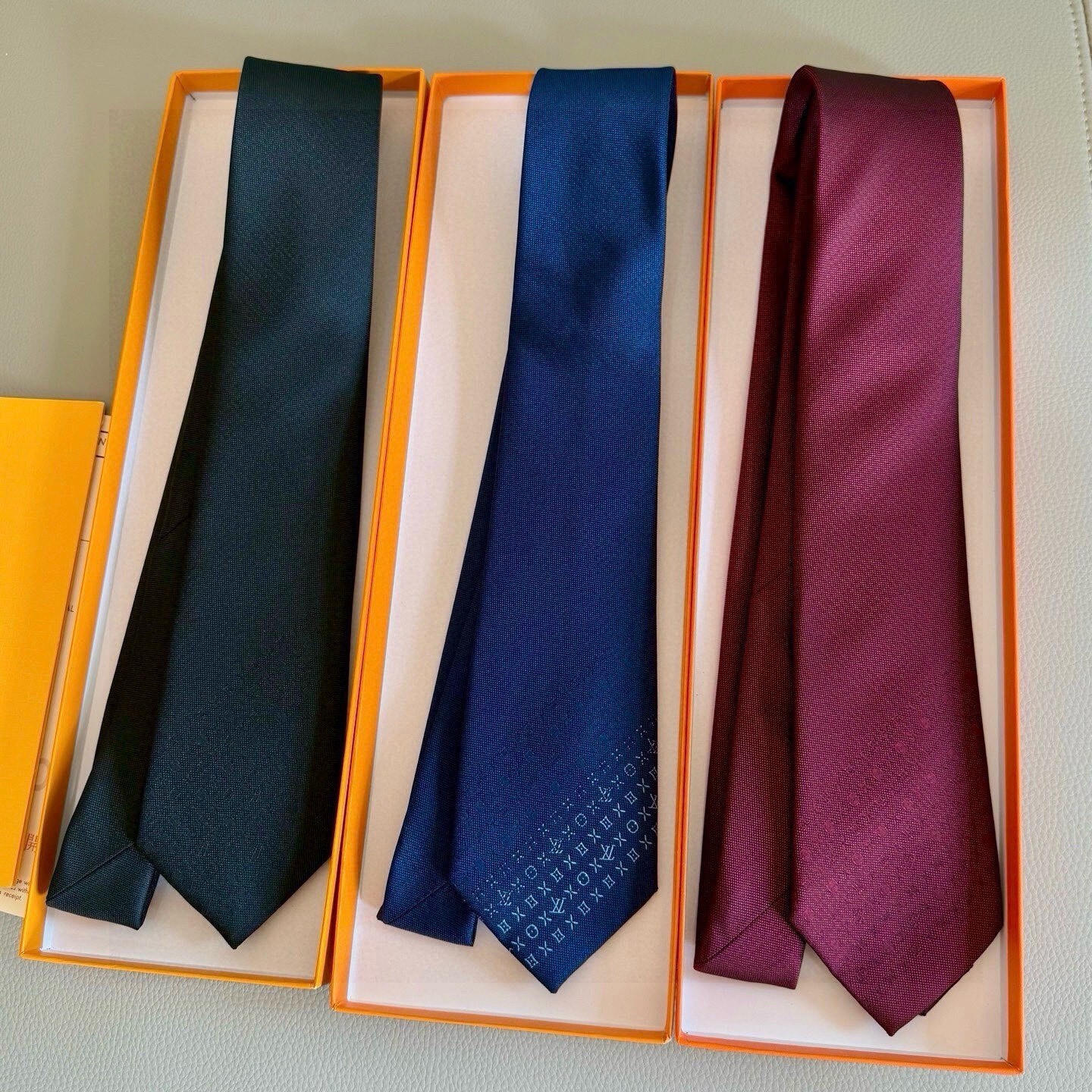 black blue Louis Vuitton Silk Tie Trio - Elevate your professional attire with the sophisticated Louis Vuitton Silk Tie Trio, featuring three distinct colors: black, blue, and burgundy. This exquisite set offers versatility and timeless elegance, making it a must-have addition to any discerning gentleman's wardrobe. The ties are crafted from 100% silk, ensuring a luxurious feel and a refined appearance. Each tie showcases the iconic Louis Vuitton craftsmanship, reflecting a commitment to quality and style. Whether you're attending a business meeting, a formal event, or simply want to enhance your everyday look, this trio provides the perfect finishing touch.