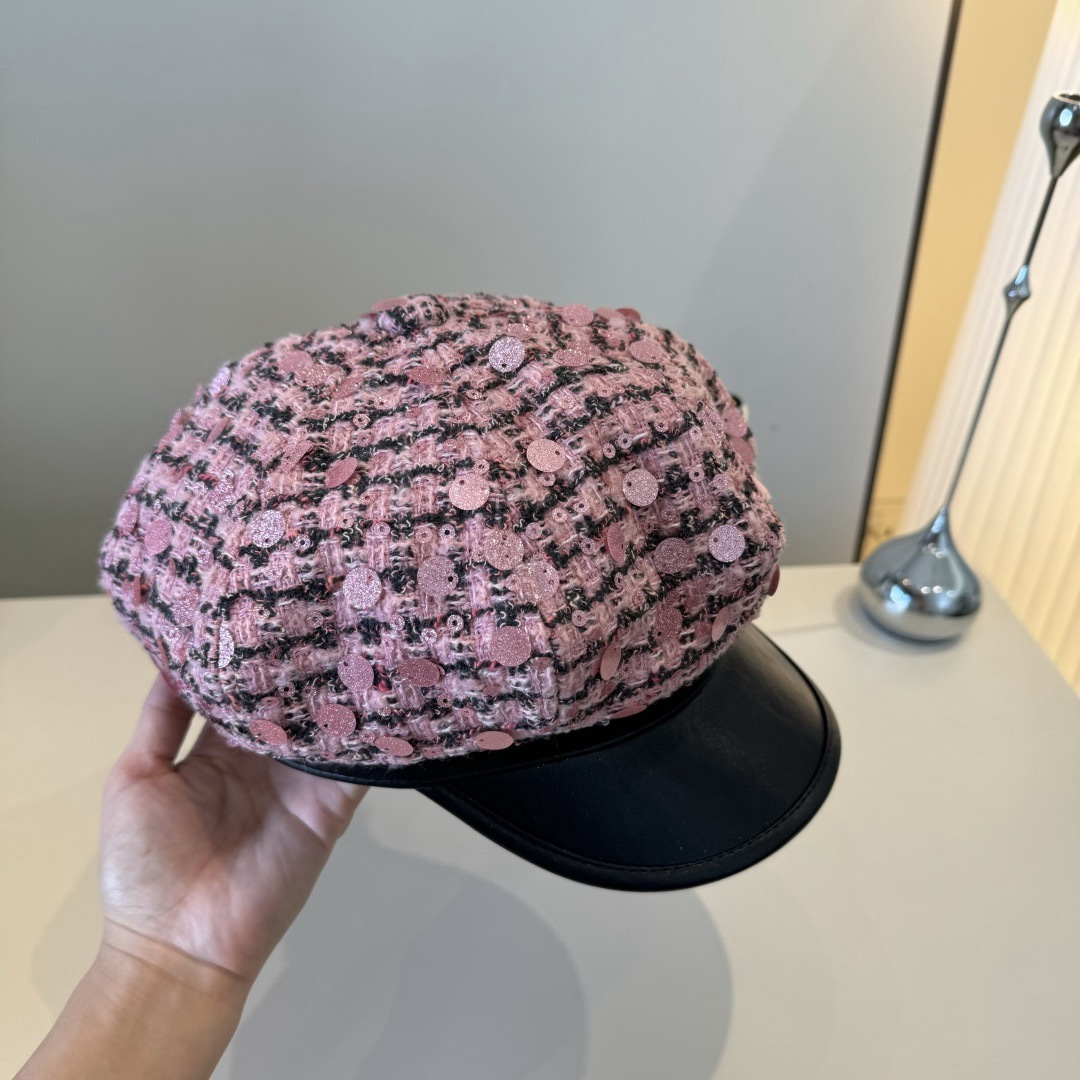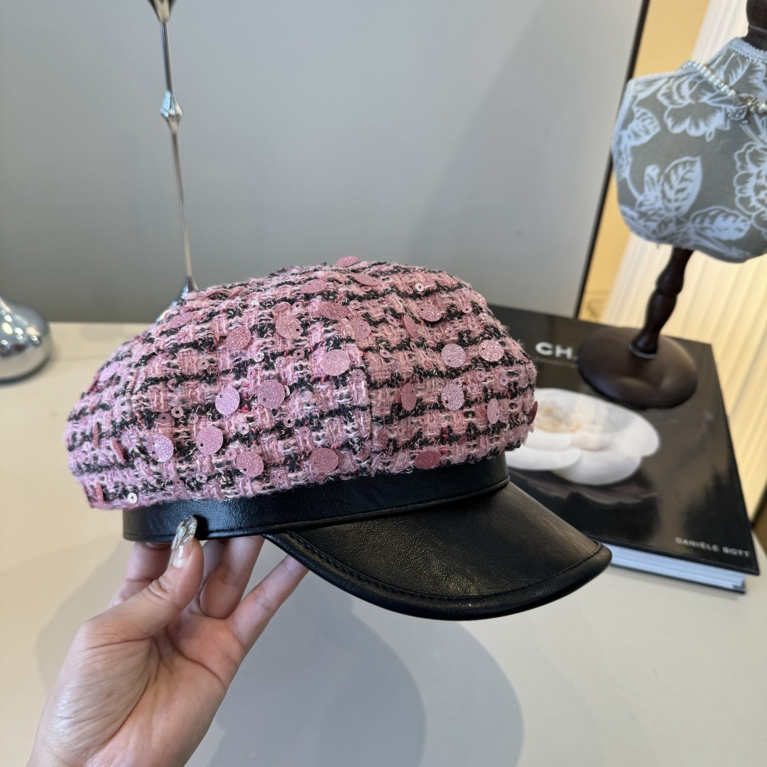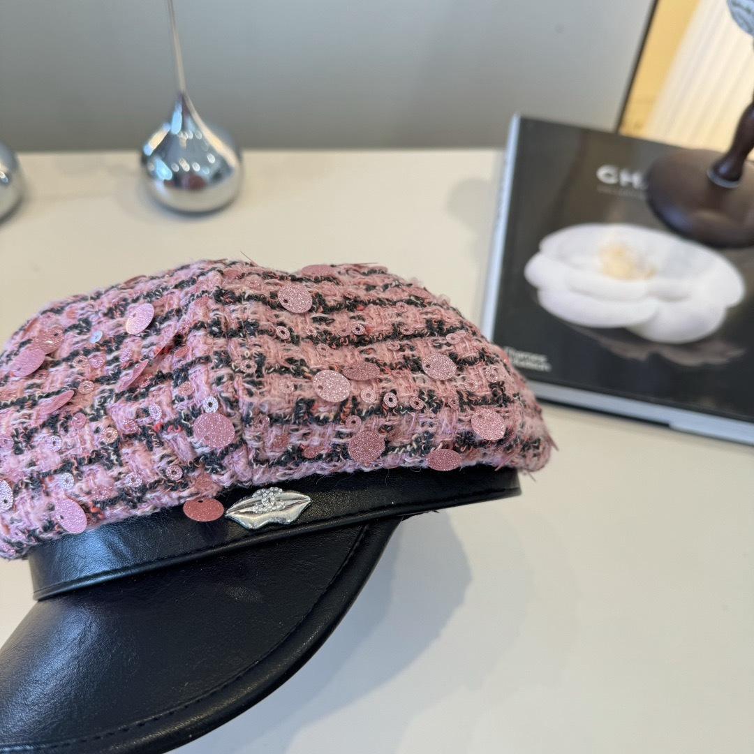 - Introducing the Chanel Pink Tweed Sequin Cap with Black Leather Brim