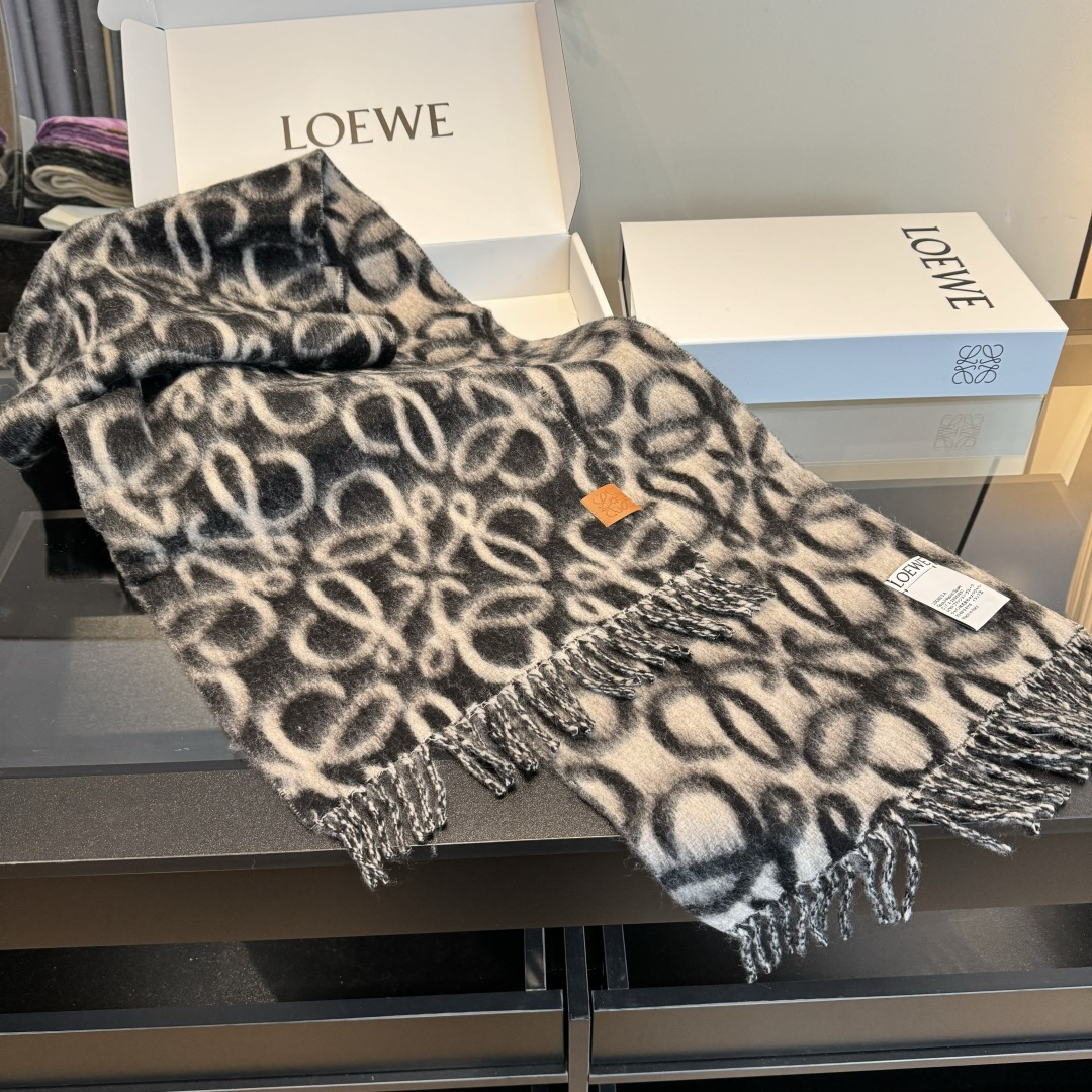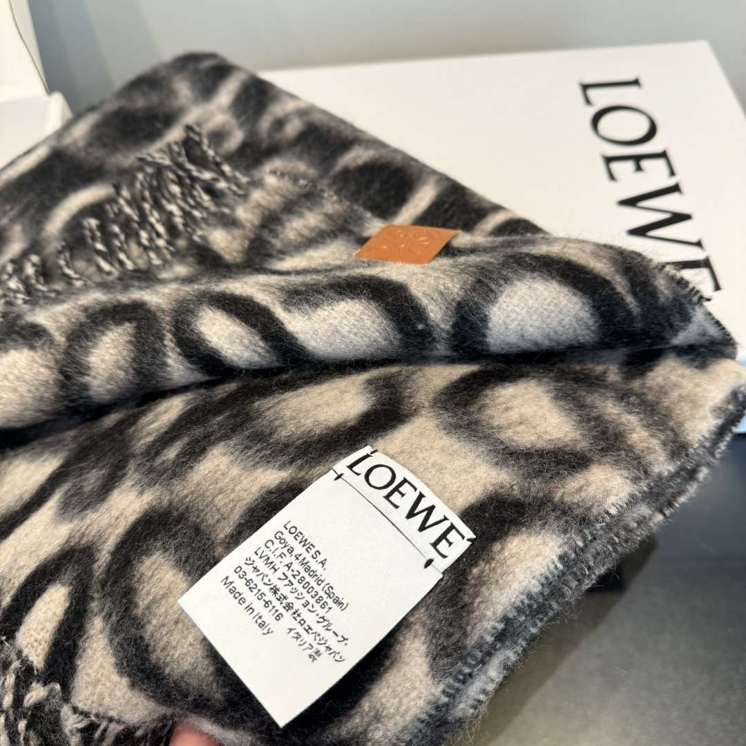 The black and beige color combination offers unparalleled versatility, making it easy to coordinate with a wide range of outfits. Whether you're wearing neutral tones, bold colors, or classic black and white, this scarf will complement your look perfectly. The timeless color palette ensures that this scarf will remain a stylish choice for any season. The subtle contrast between the black and beige tones adds visual interest without being overwhelming. The Loewe Anagram Jacquard Wool Scarf is a versatile accessory that can be dressed up or down, making it suitable for any occasion.