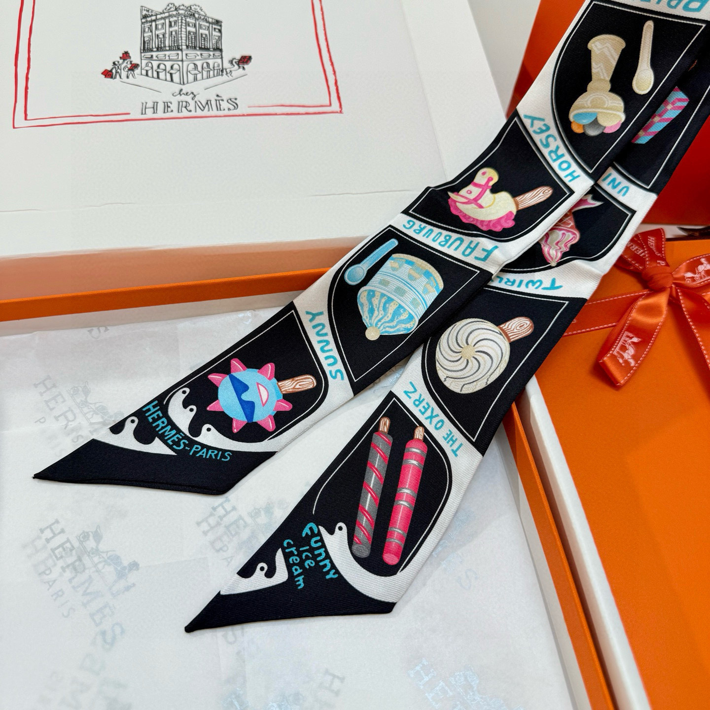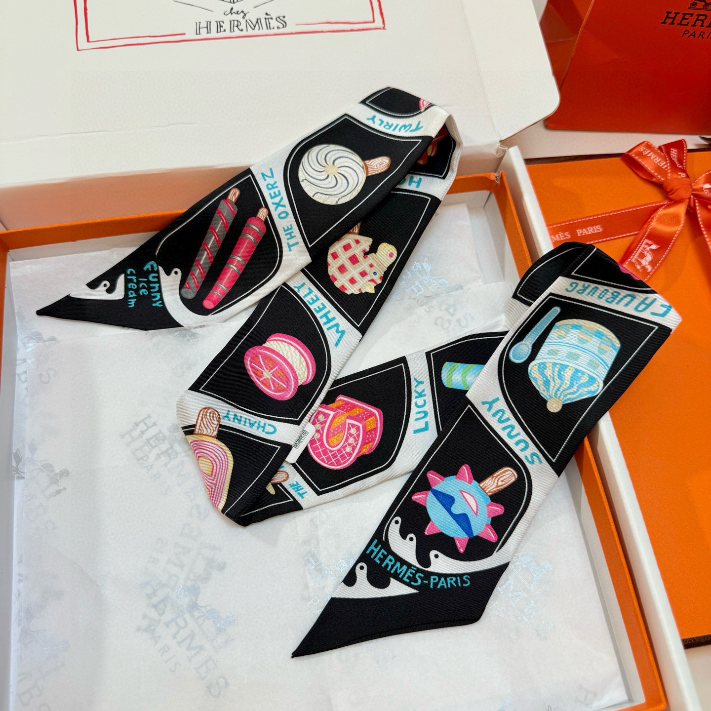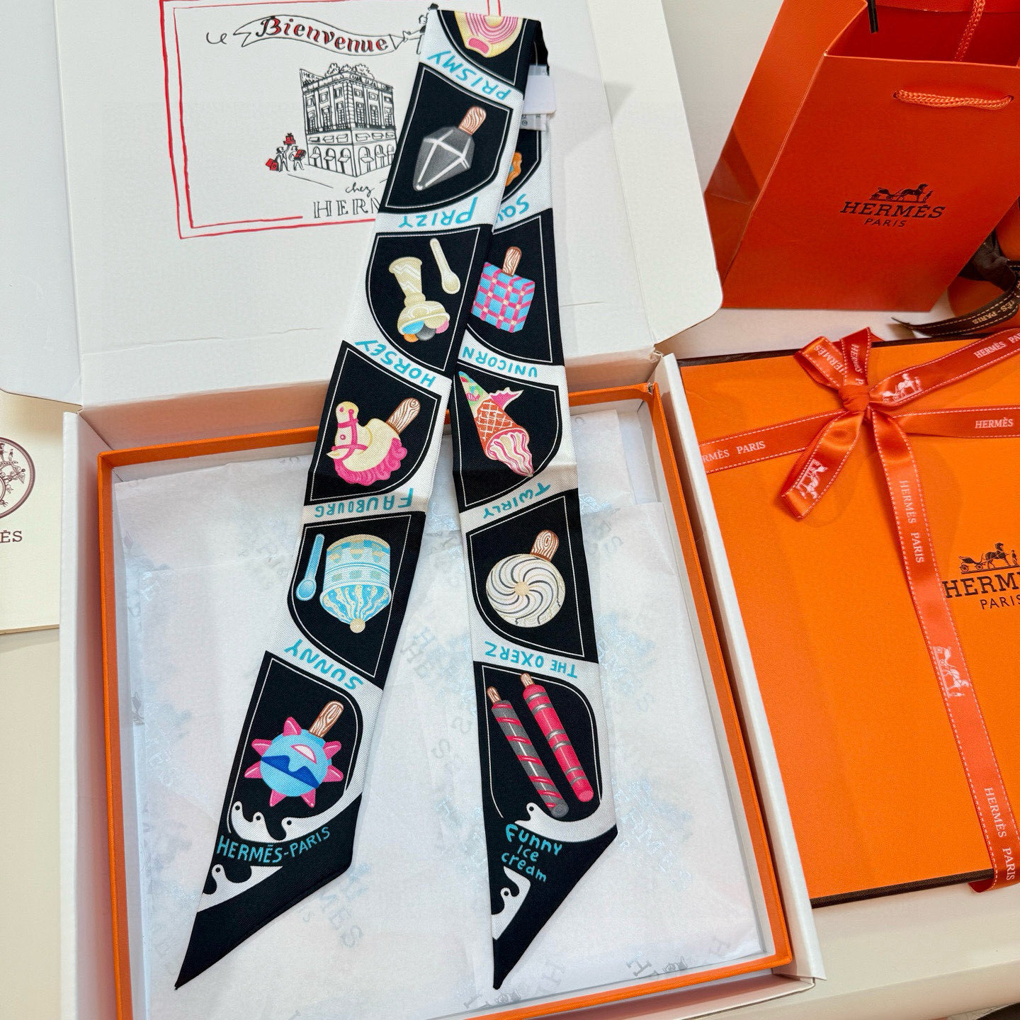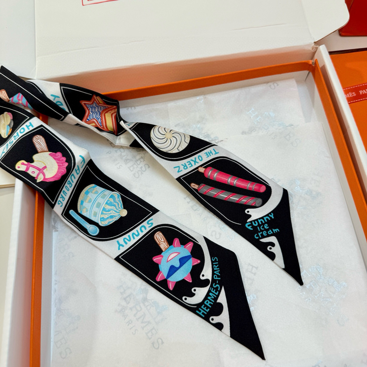 A twilly scarf is a long, narrow scarf made from silk, typically used as a versatile accessory that can be tied around the neck, wrist, handbag handles, or worn as a hair accessory. The Hermès Black & White 'Funny Ice Cream' Twilly Scarf is a perfect example of this stylish accessory.