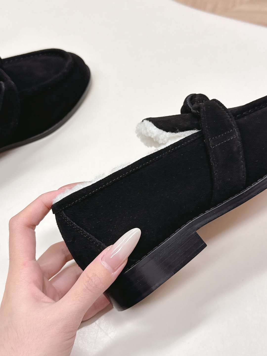 These loafers feature a classic silhouette with a modern twist. The black suede upper is complemented by a subtle knot detail, adding a touch of sophistication without being overly flashy. The fur lining peeks out slightly, creating a visually appealing contrast between the dark suede and the light fur. The overall design is understated yet elegant, making these loafers versatile enough to be paired with a variety of outfits.
