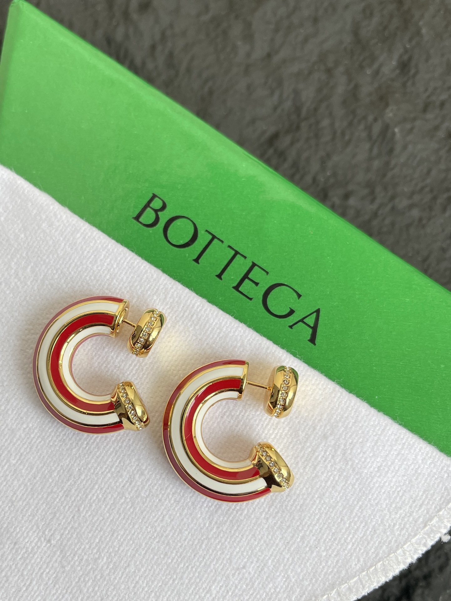 Bottega Veneta Red Hoop Earrings - Elevate your style with the exquisite Bottega Veneta Red & White Hoop Earrings. These designer earrings are a perfect blend of luxury and modern chic, crafted to add a touch of sophistication to any outfit. The striking red and white enamel detailing, complemented by the gleaming gold-tone hardware, makes these hoops a standout accessory for fashion-forward individuals.