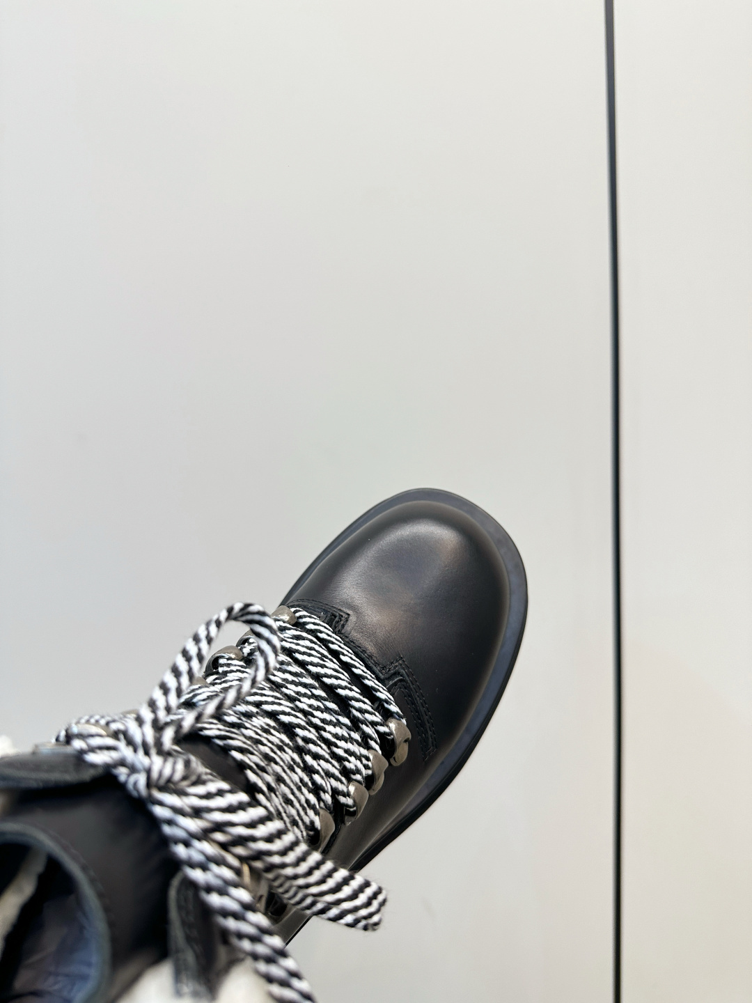 The Bottega Veneta Black Leather Shearling Lined Boots feature a classic lace-up design, allowing for a customizable and secure fit. The shearling trim adds a touch of luxury and sophistication, while the subtle branding ensures a refined and understated look. Every aspect of these boots is carefully considered to deliver a product that exceeds expectations in both style and performance.