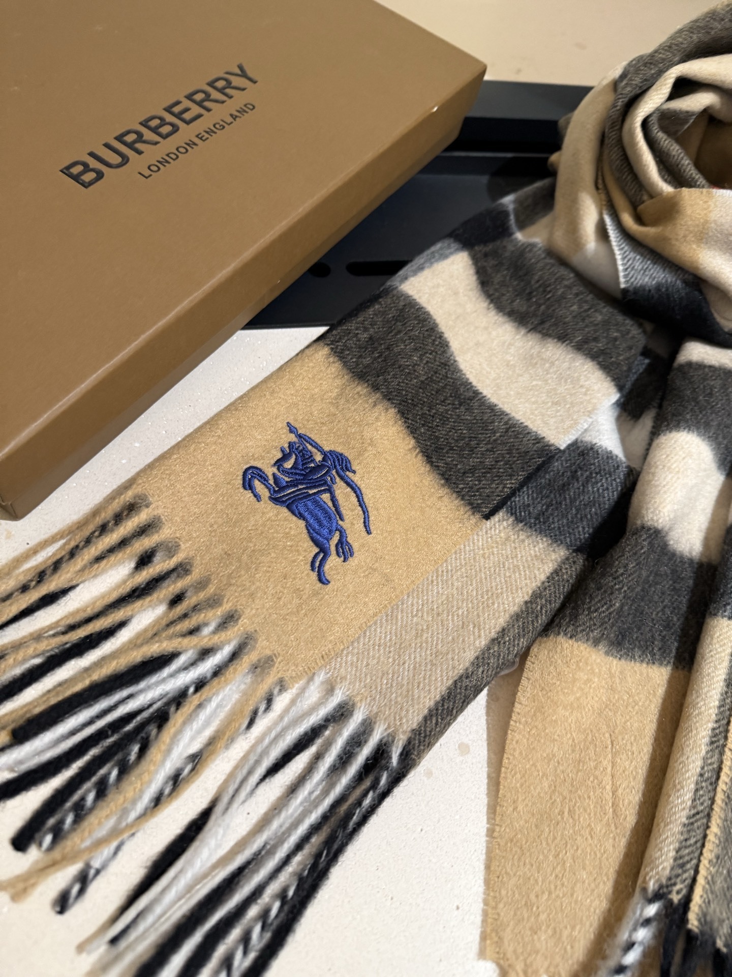 Q: What is the material of the Burberry Camel Check Cashmere Scarf?