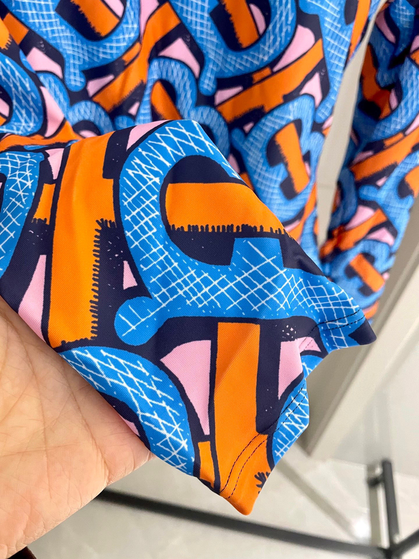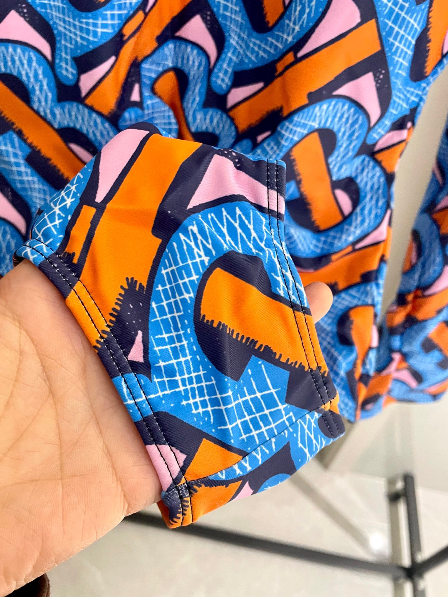This swimsuit features a captivating print with a dynamic blend of blues, oranges, and pinks, creating a visually striking and sophisticated look. The long sleeves provide excellent sun protection, making it ideal for extended periods in the water or lounging by the pool. The high neckline adds a touch of elegance, while the form-fitting design accentuates your curves for a flattering silhouette.