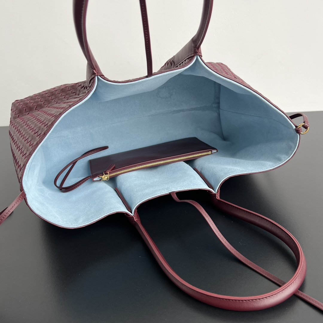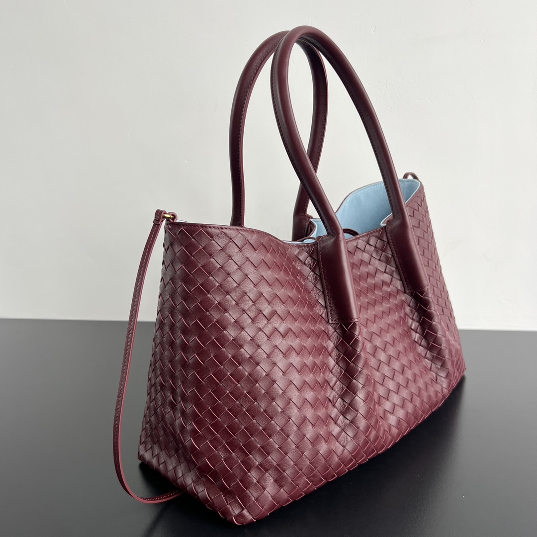 The light blue lining adds a pop of color and a touch of whimsy to the interior, creating a delightful contrast with the rich burgundy exterior. The spacious interior offers ample room for all your essentials, while the sturdy leather handles provide comfortable carrying options. The bag also features subtle branding, reflecting Bottega Veneta's understated elegance.