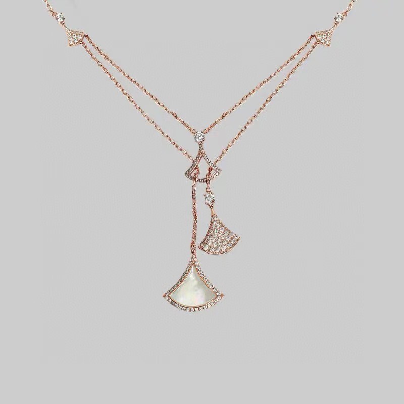 The Bvlgari Rose Gold Divas' Dream Necklace is more than just a piece of jewelry; it's a statement of style and luxury. The intricate design, featuring the signature fan-shaped motif, is both classic and contemporary. The use of high-quality rose gold gives the necklace a warm and radiant glow, while the diamonds add a touch of sparkle and sophistication. This necklace is perfect for those who appreciate fine craftsmanship and timeless elegance. Whether worn for a special occasion or as an everyday accessory, the Divas' Dream Necklace is sure to turn heads.