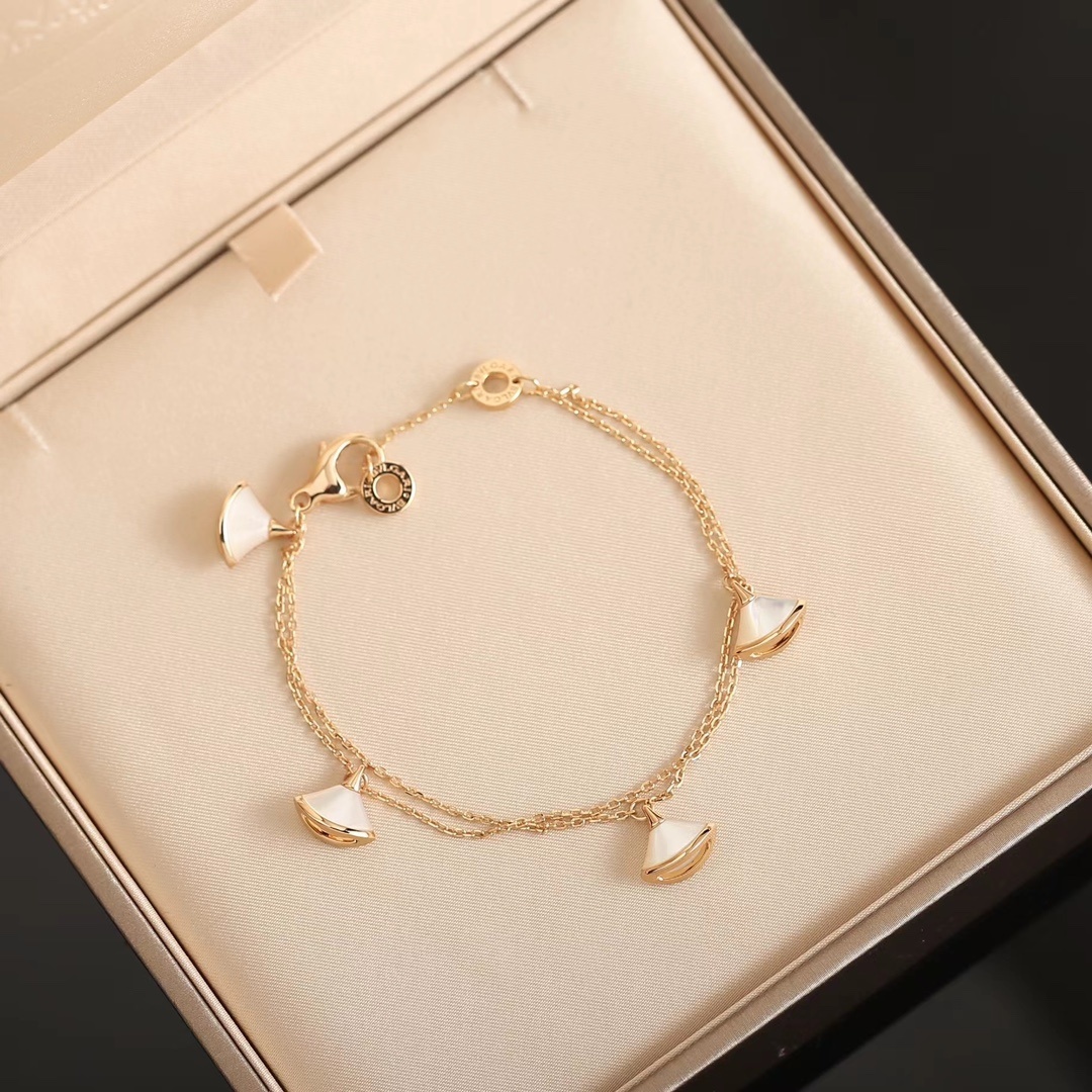 The bracelet features a series of delicate charms inspired by the Divas' Dream collection, including the iconic fan-shaped motif. These charms are carefully arranged along the bracelet, creating a harmonious and visually stunning design. Each charm is a miniature work of art, showcasing Bvlgari's expertise in jewelry design.