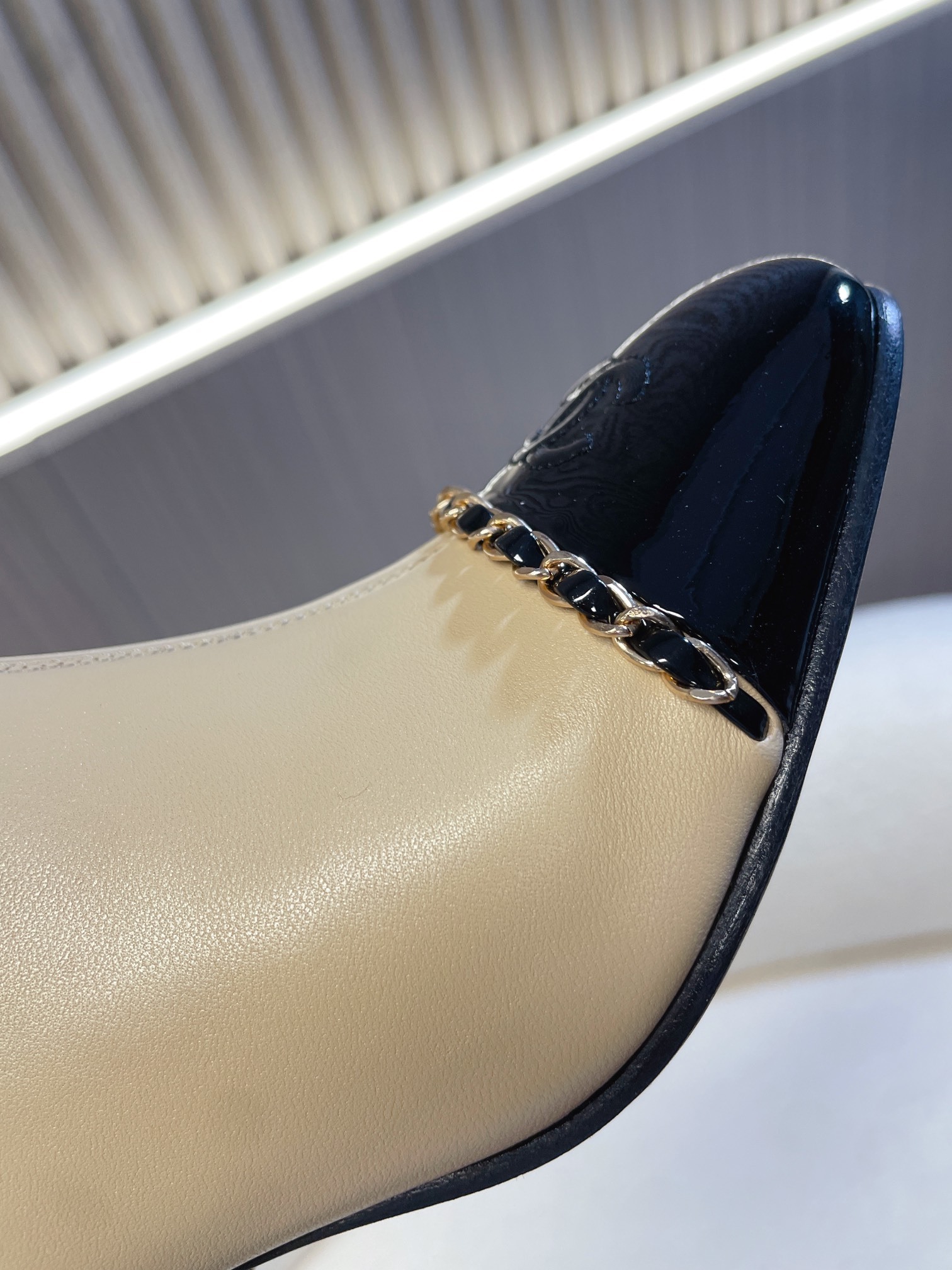 The unique combination of beige leather and black patent leather creates a striking contrast that catches the eye. The delicate chain detail adds a touch of glamour, making these booties a true work of art. Designed for comfort and style, they offer a perfect fit and effortless sophistication.
