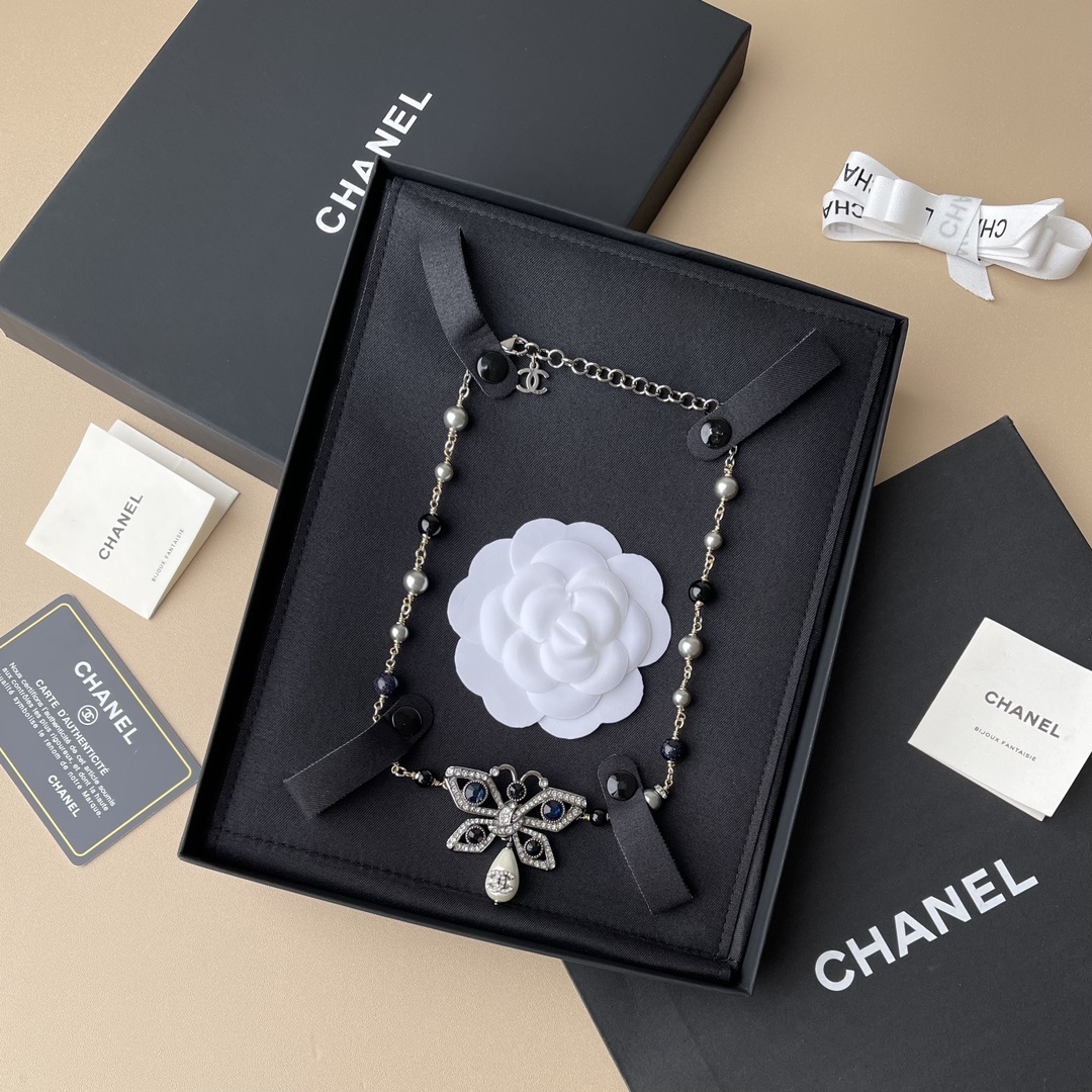 The Chanel Black Pearl Dragonfly Necklace is crafted with high-quality materials, including lustrous black pearls, sparkling crystals, and a durable metal base. The chain is designed for comfort and durability, ensuring that the necklace sits perfectly on the neckline. These materials are carefully selected to ensure the longevity and beauty of the necklace.