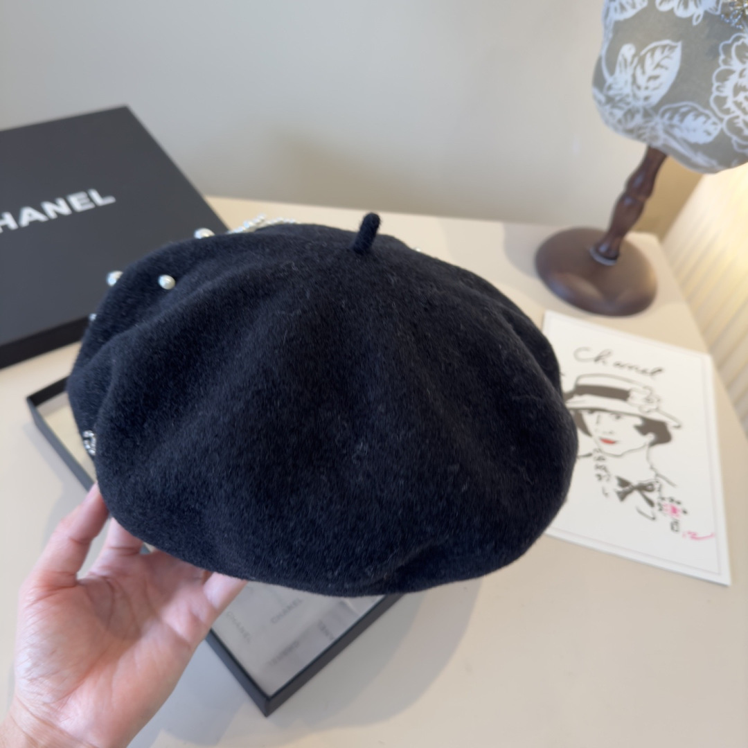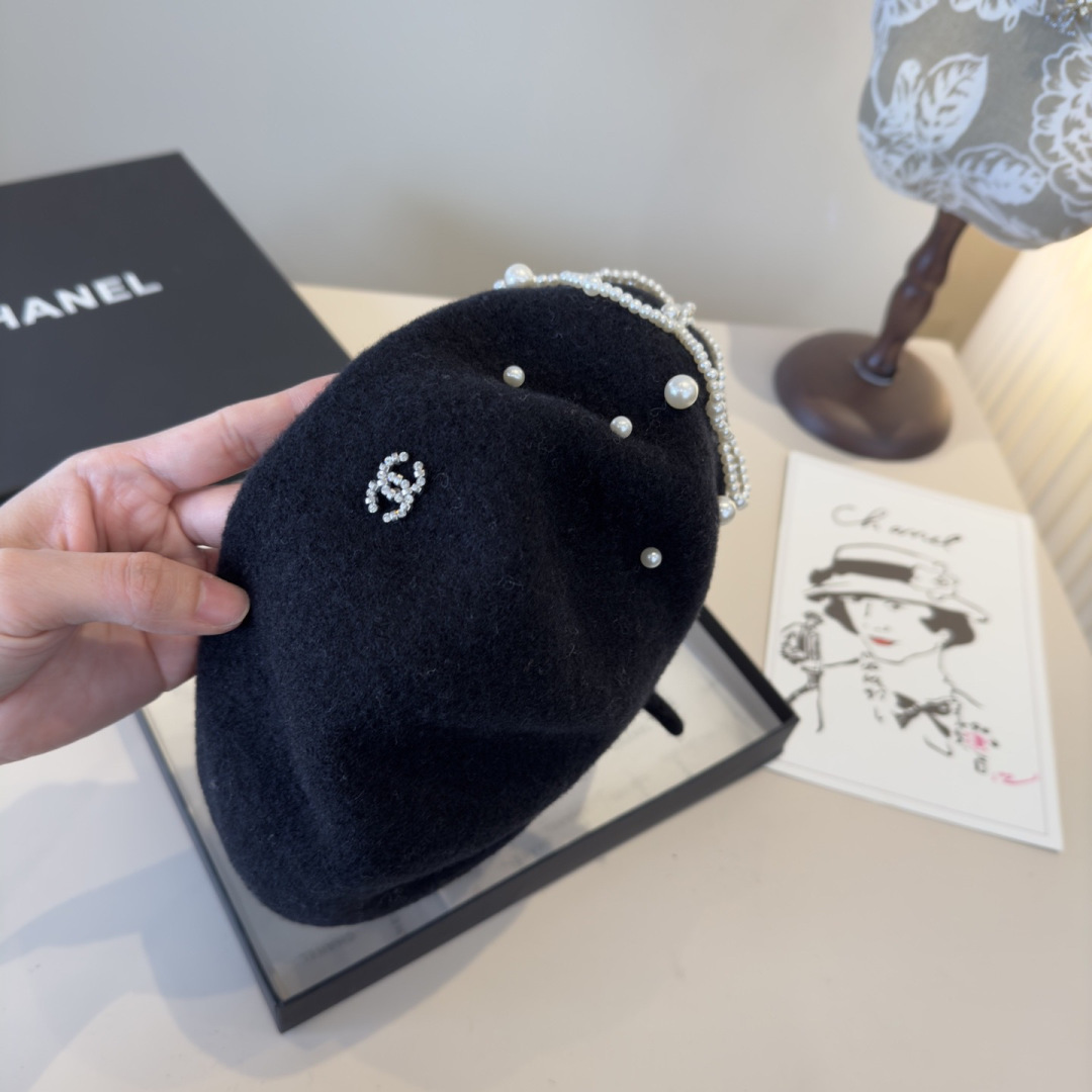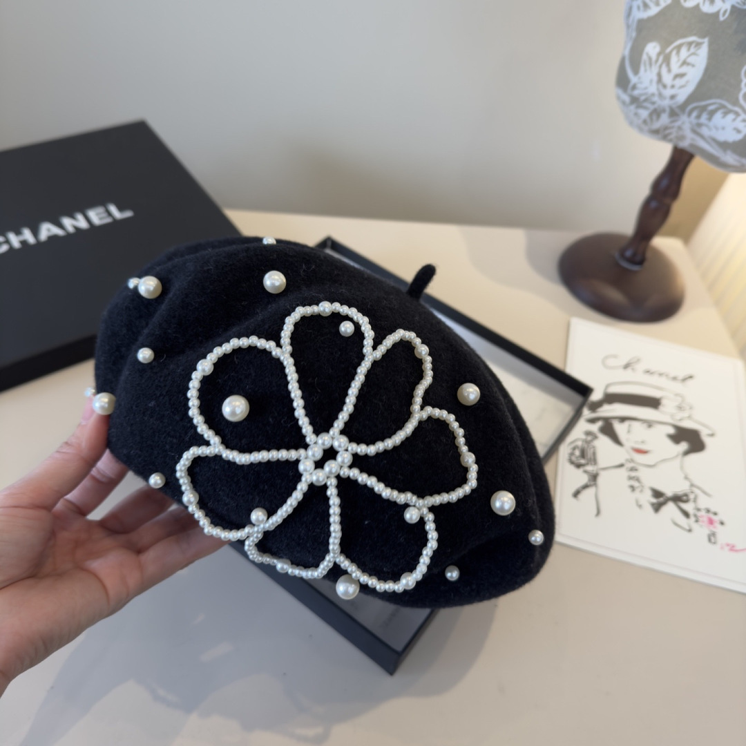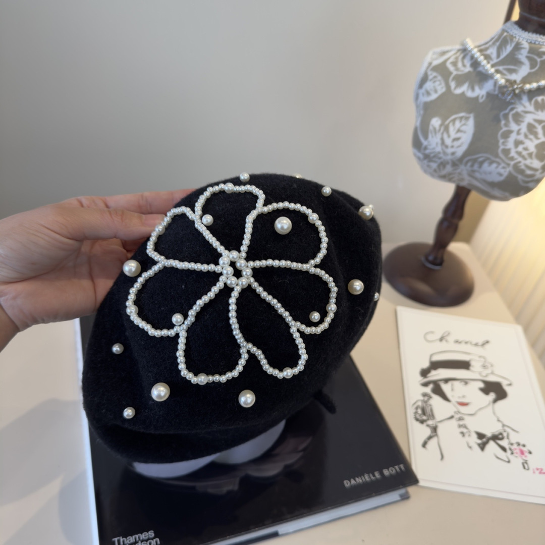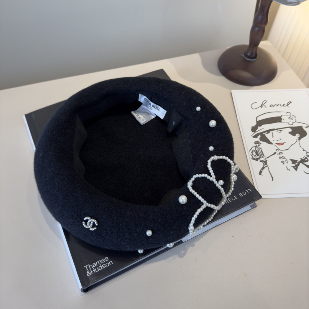 - Introducing the Chanel Black Wool Beret with Pearl Embellishments
