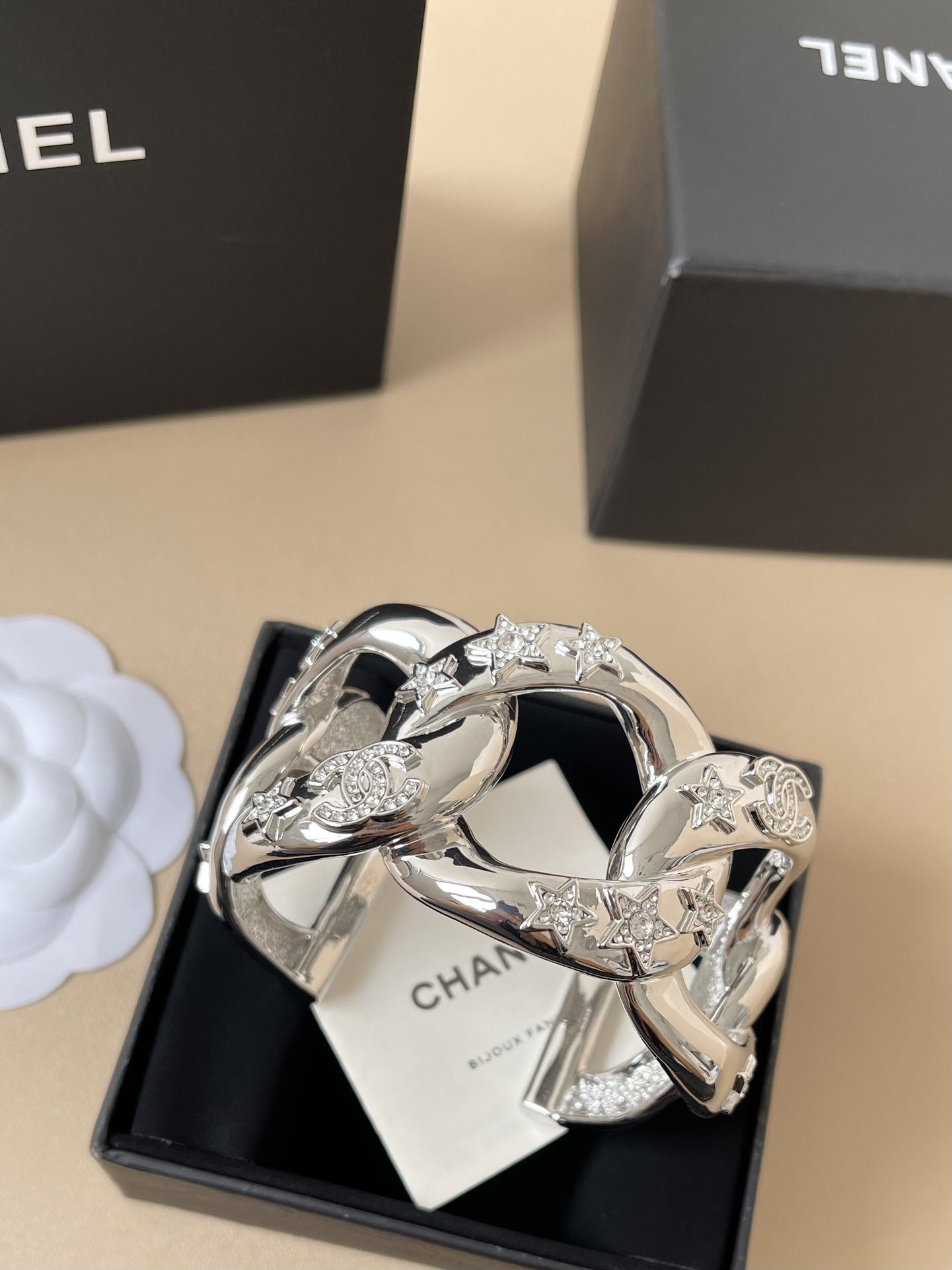 Indulge in the epitome of luxury with the Chanel Chain Link Cuff Bracelet. This exquisite piece from the premium bracelet collection is designed to make a statement, adding a touch of timeless elegance to any ensemble. Crafted with meticulous attention to detail, this bracelet embodies the iconic Chanel aesthetic, blending bold design with sophisticated sparkle.