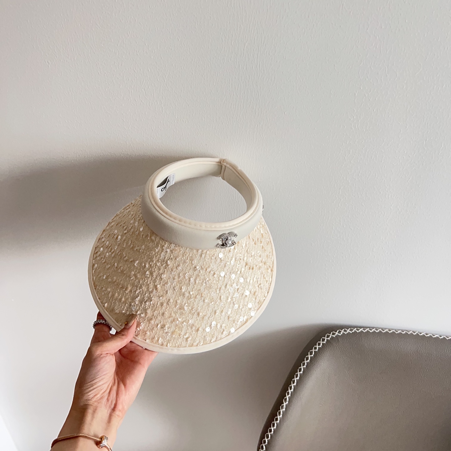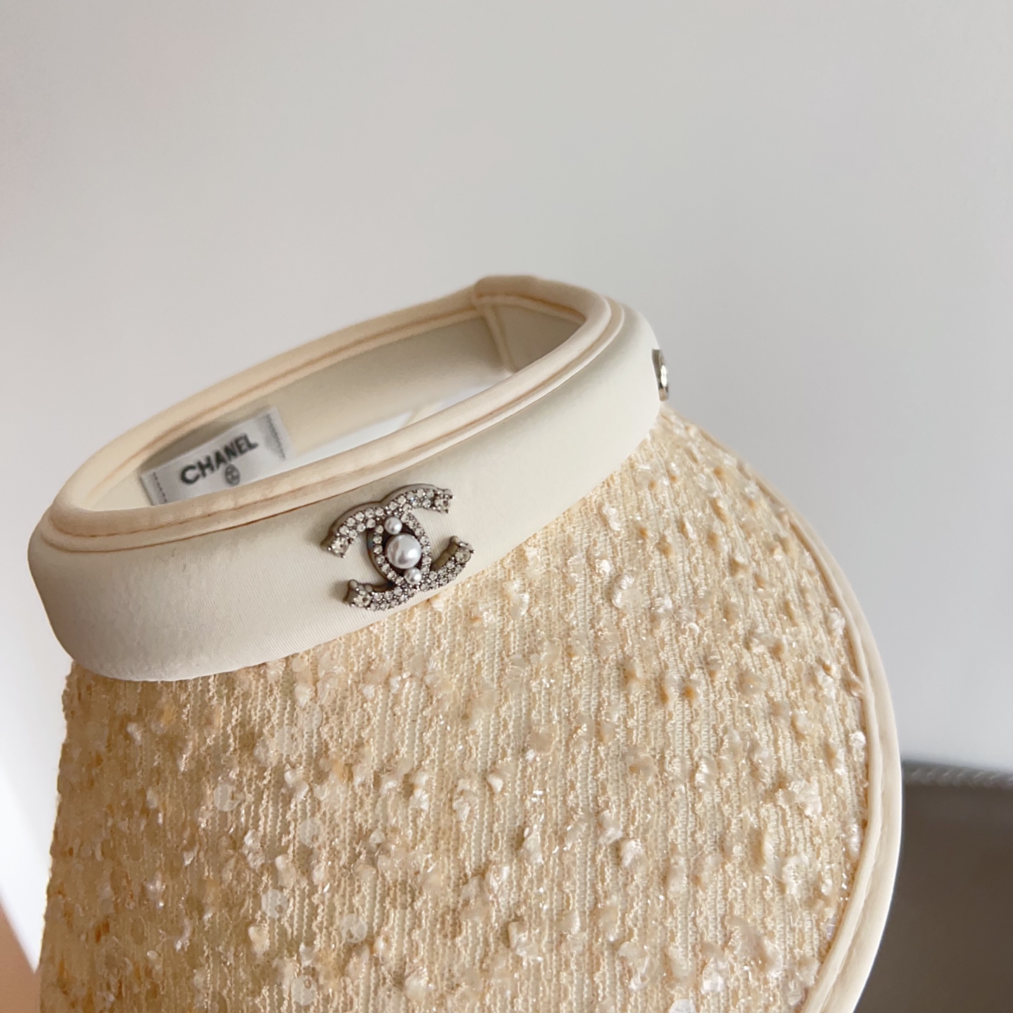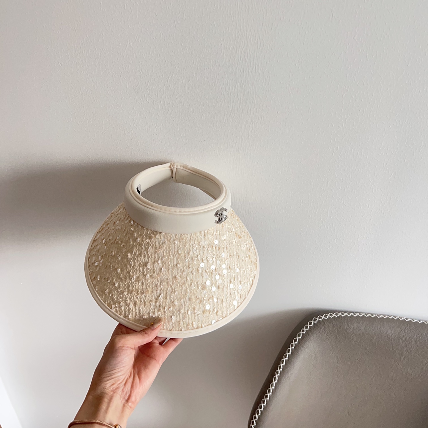 The cream color of the visor is carefully chosen to complement a wide range of skin tones and outfits. The sequins are selected for their ability to reflect light, adding a subtle shimmer that enhances the overall aesthetic. The Chanel logo is discreetly placed to add a touch of luxury without overpowering the design. The overall effect is one of understated elegance and sophistication.