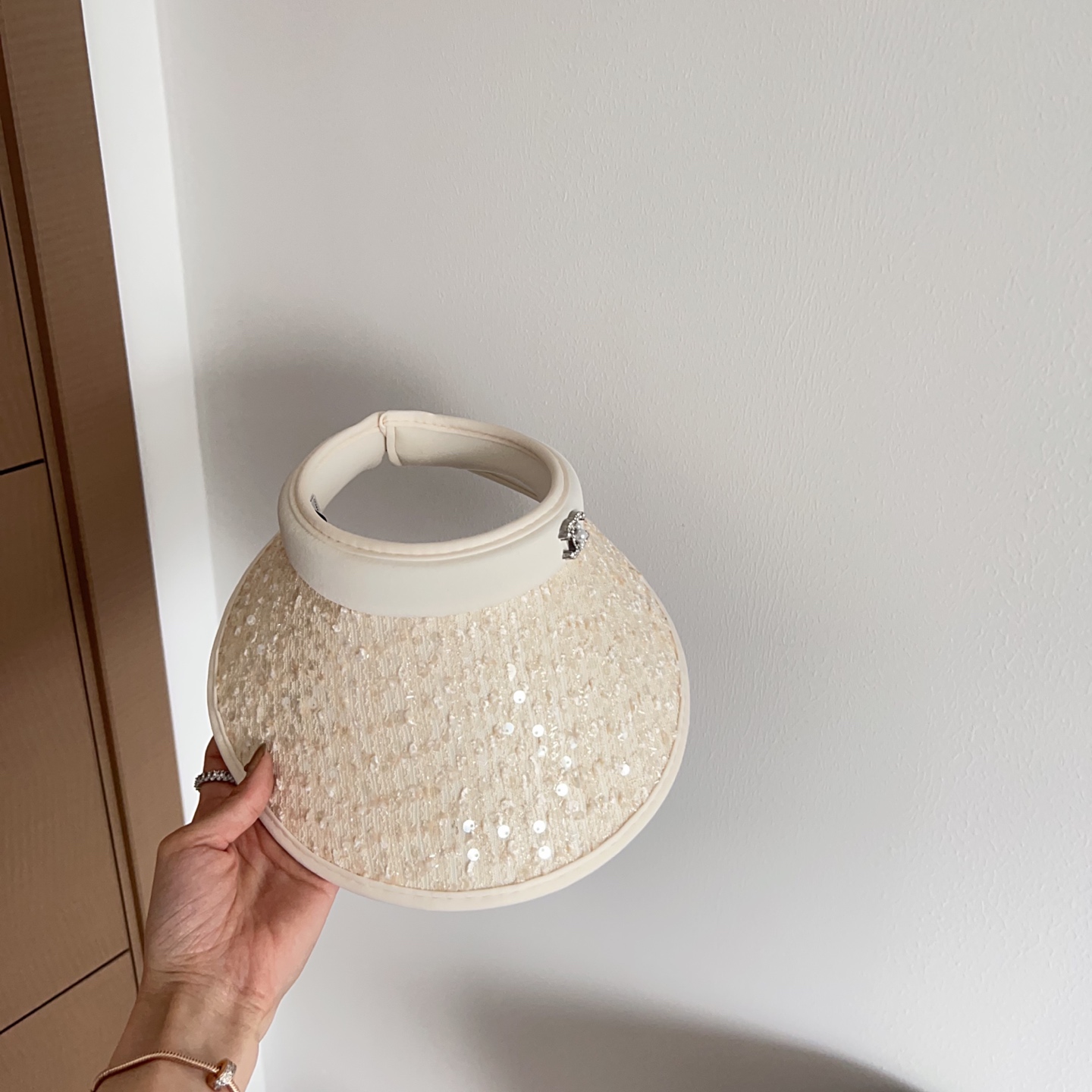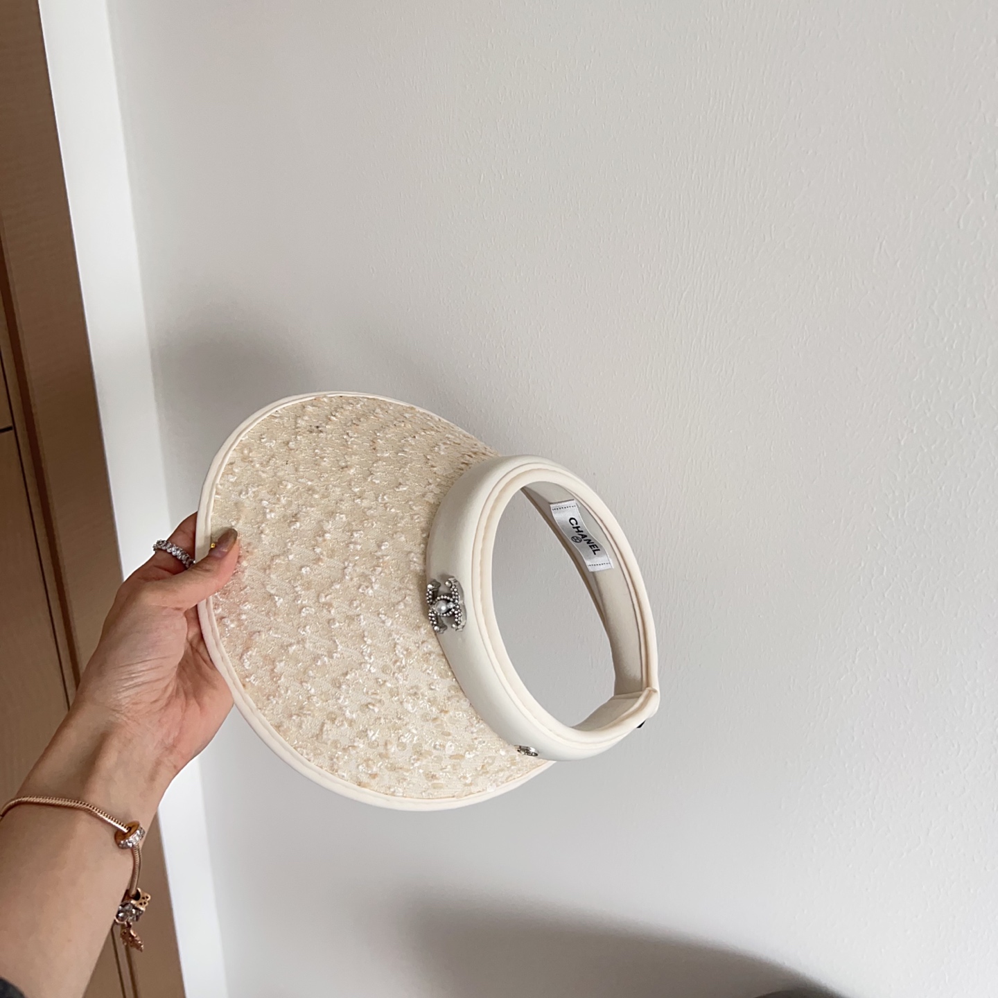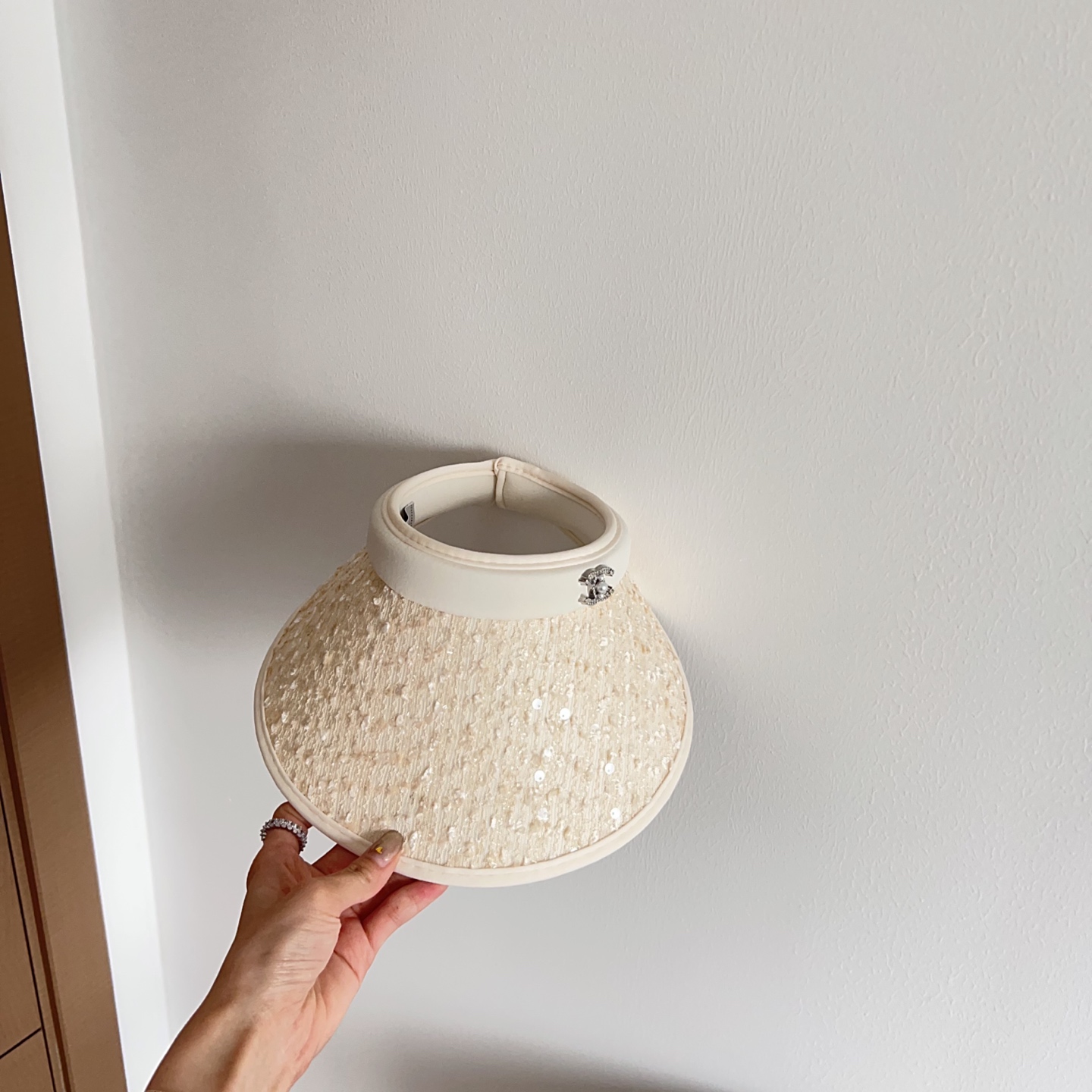 The cream color of the visor is carefully chosen to complement a wide range of skin tones and outfits. The sequins are selected for their ability to reflect light, adding a subtle shimmer that enhances the overall aesthetic. The Chanel logo is discreetly placed to add a touch of luxury without overpowering the design. The overall effect is one of understated elegance and sophistication.