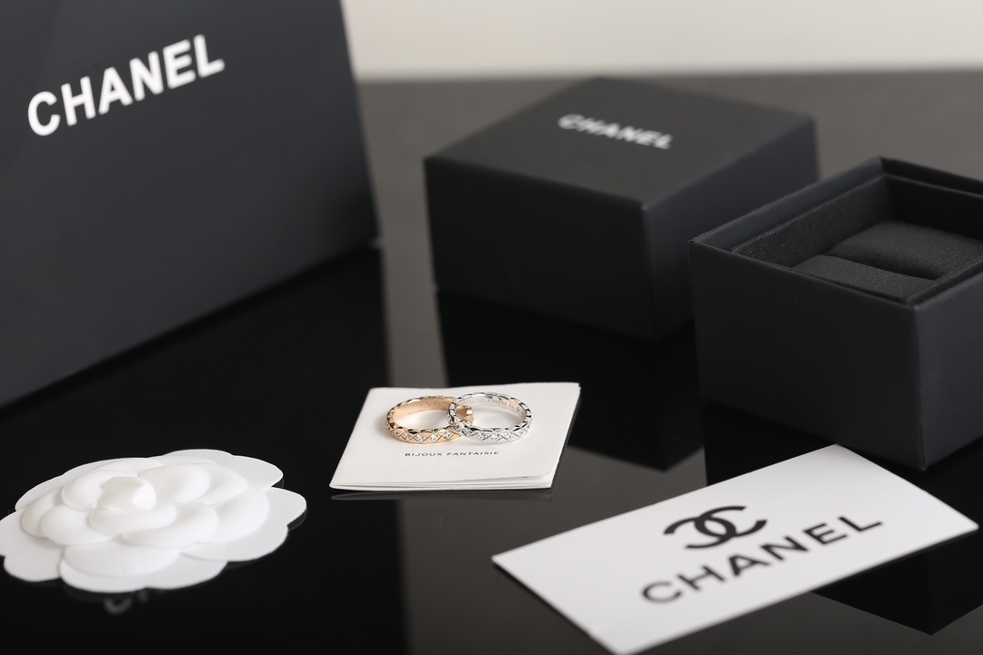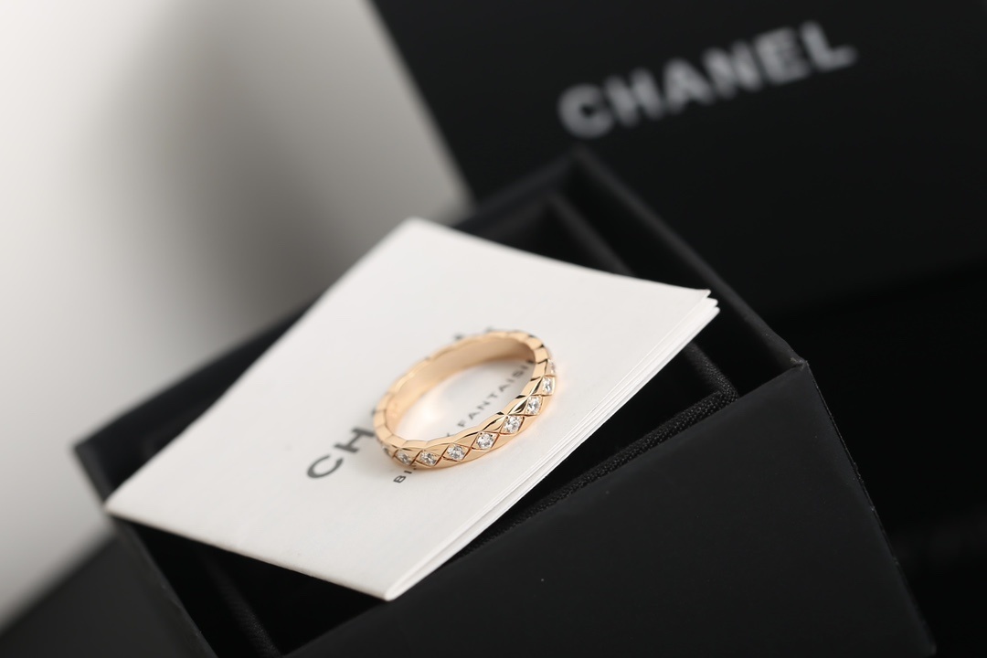 The diamonds are set in a way that maximizes their sparkle while also ensuring their security. The quilted pattern is intricately crafted, showcasing Chanel's commitment to impeccable craftsmanship. Each ring undergoes rigorous quality control to ensure it meets the highest standards of excellence.