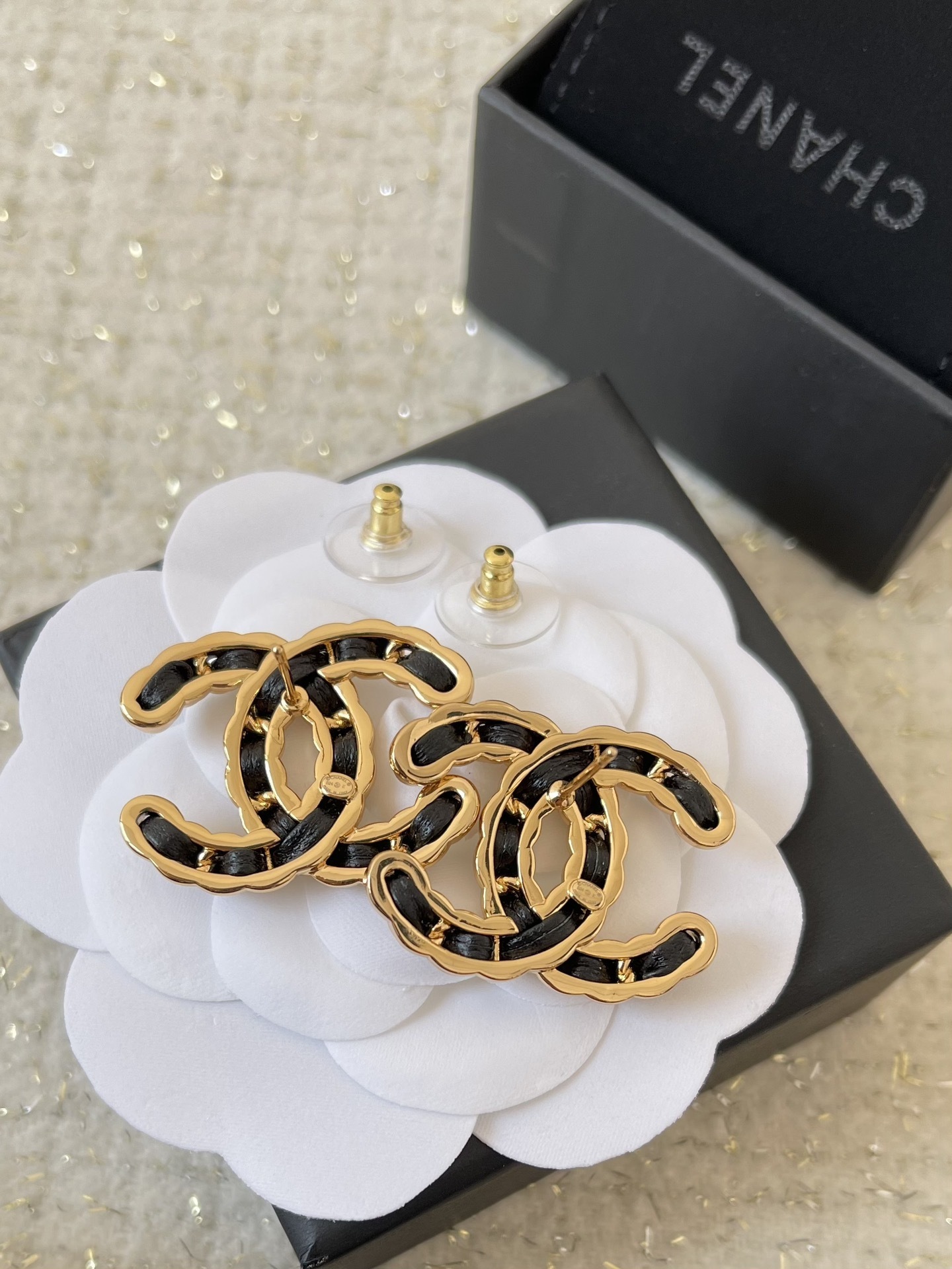 The earrings feature a classic stud design, making them easy to wear and versatile enough to complement a wide range of outfits. The secure backings ensure that the earrings stay in place, providing peace of mind while you go about your day. The combination of gold and black creates a striking contrast that is both elegant and eye-catching. These earrings are the perfect way to add a touch of Chanel's signature style to any look.