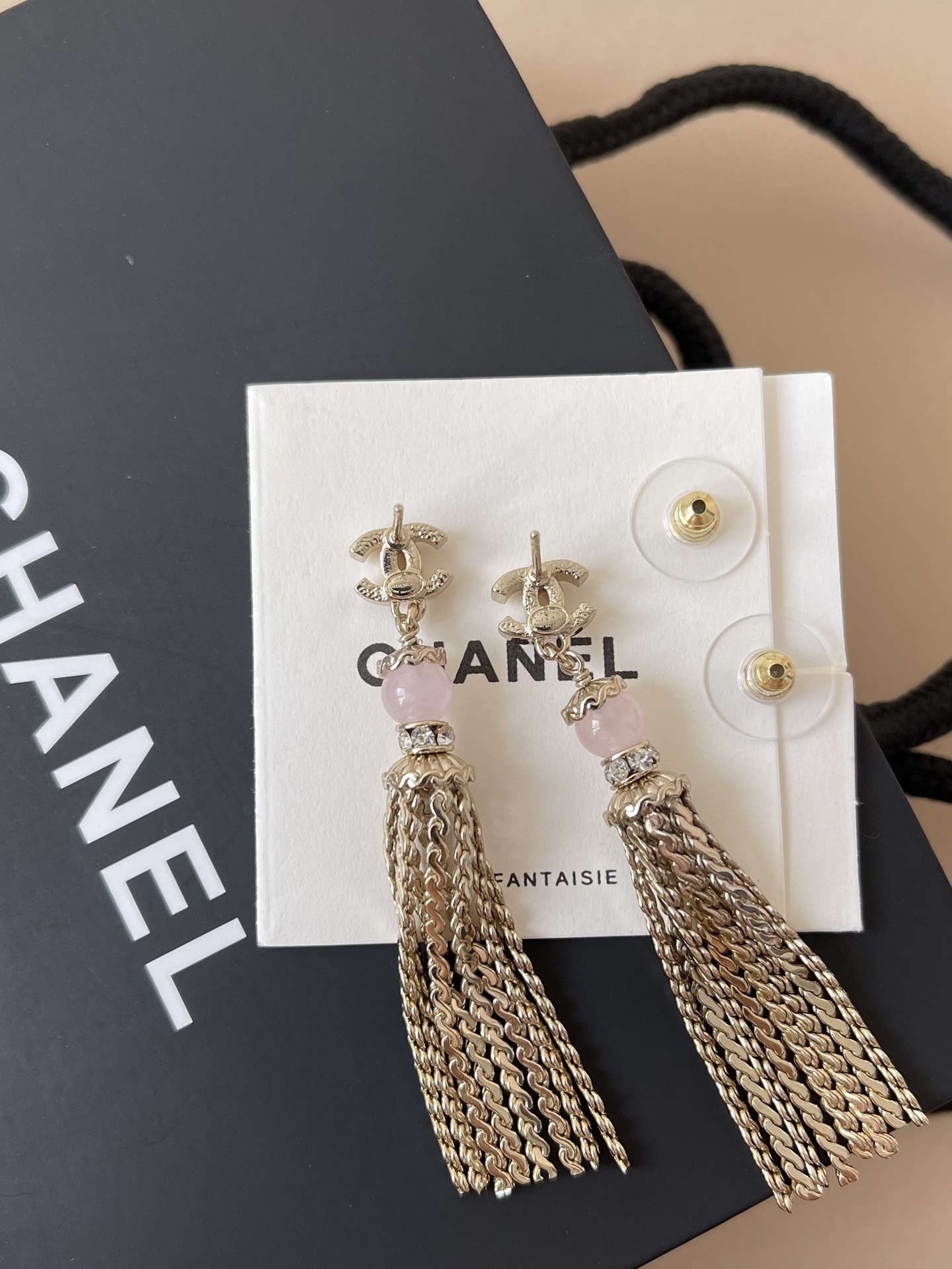 There are many reasons to choose Chanel Gold Chain Tassel Earrings. First and foremost, they are a symbol of luxury and status, instantly elevating any outfit. The timeless design ensures that these earrings will remain stylish for years to come, making them a worthwhile investment. The unique combination of gold, rose quartz, and chain tassels creates a captivating and eye-catching look.