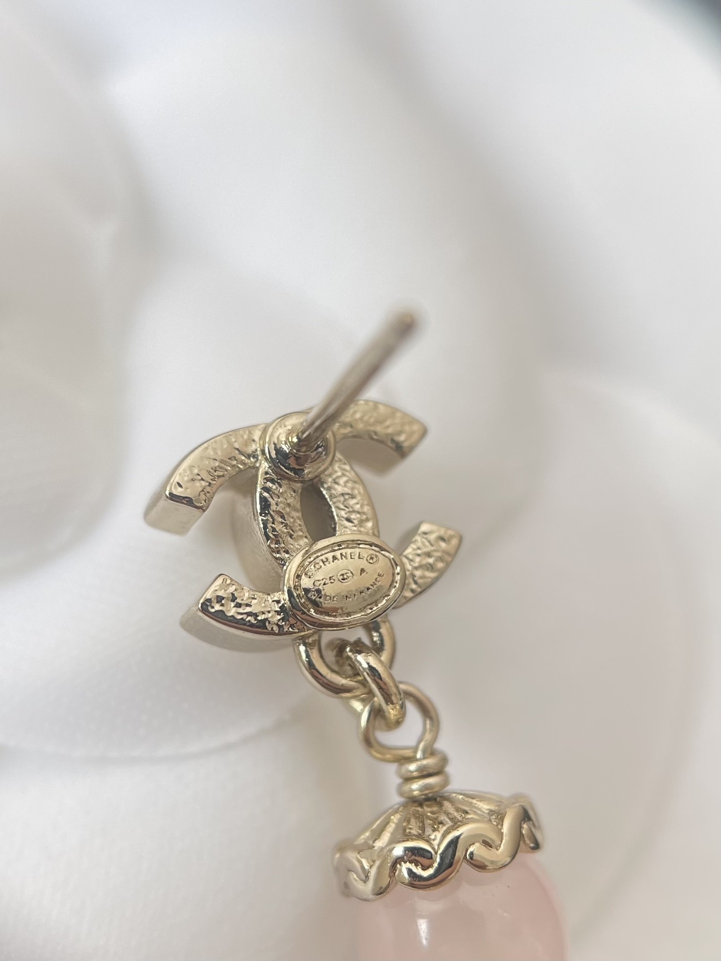 The Chanel Gold Chain Tassel Earrings boast several distinctive features that set them apart from other accessories. The earrings start with the iconic Chanel logo, crafted in lustrous gold, symbolizing the brand's legacy of luxury and innovation. Below the logo, a soft rose quartz stone adds a touch of femininity and subtle color. The main attraction is the cascade of fine gold chains, meticulously arranged to create a flowing tassel effect. These chains catch the light beautifully, creating a captivating shimmer with every movement. The combination of gold, rose quartz, and intricate chain work makes these earrings a true work of art.