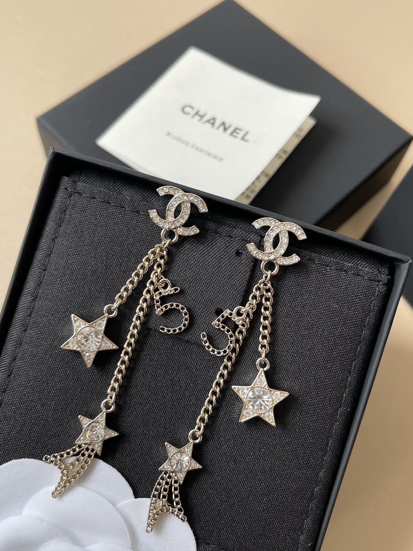 The Chanel Gold Star Dangle Earrings boast several standout features that make them a must-have accessory. The intricate design includes multiple gold chains that cascade gracefully, creating a beautiful sense of movement. Each earring features the iconic Chanel '5' charm, a nod to the brand's legendary fragrance. Sparkling star accents add a touch of whimsy and sparkle, making these earrings perfect for both daytime and evening wear.