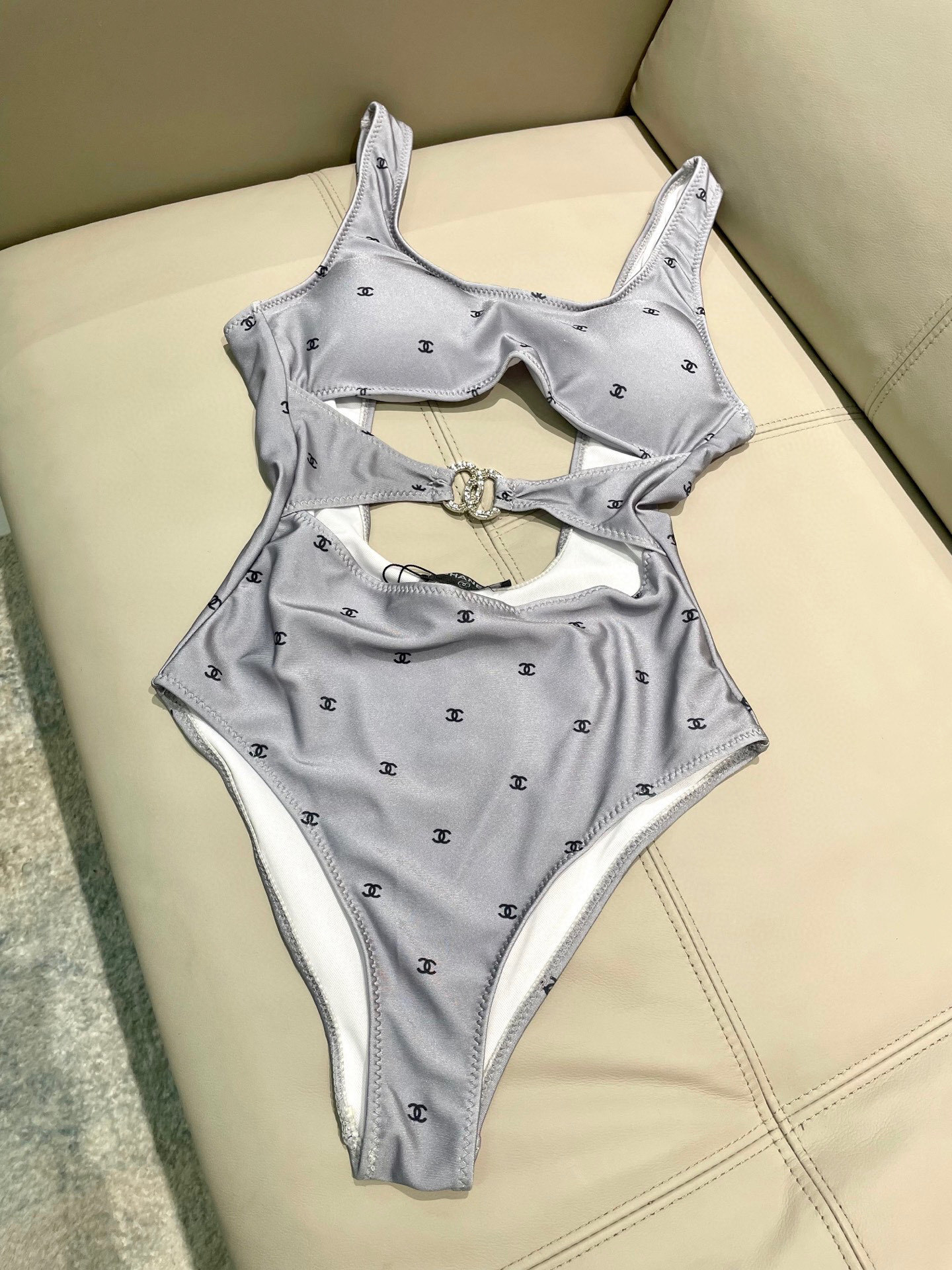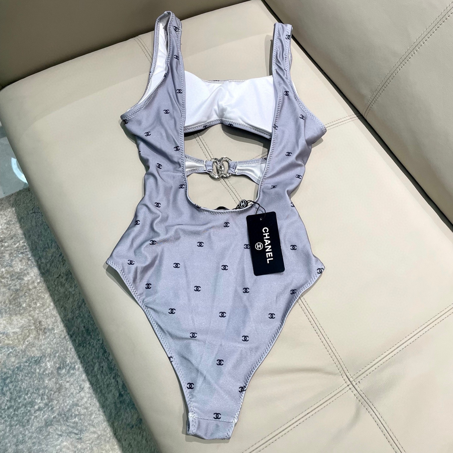 This swimsuit is more than just apparel; it's a statement. The subtle yet distinctive Chanel-inspired pattern adds a touch of class, while the carefully chosen fabric ensures a comfortable and flattering fit. The unique cut-out design on the back adds a modern twist to the classic one-piece silhouette.