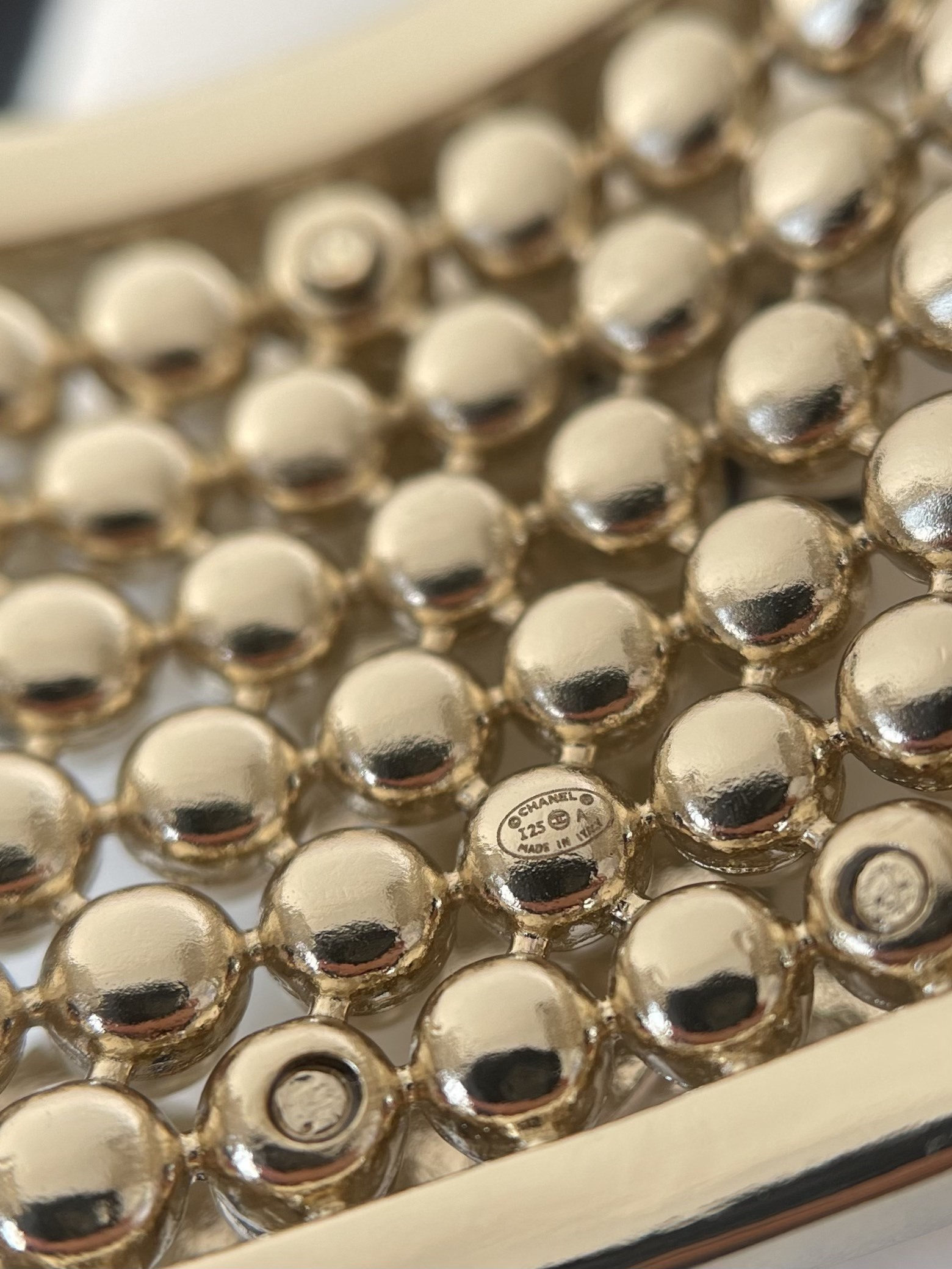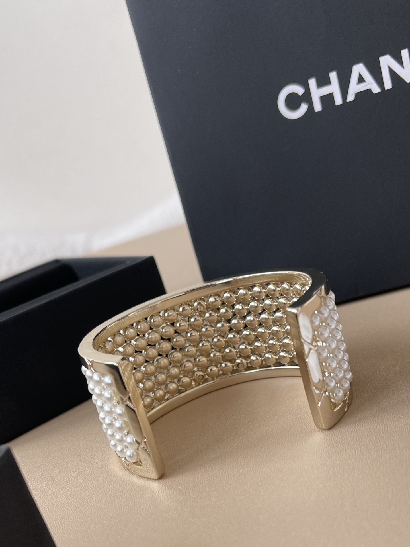 - Design: A wide cuff design featuring rows of lustrous pearls, accented by the iconic Chanel logo encrusted with sparkling crystals.