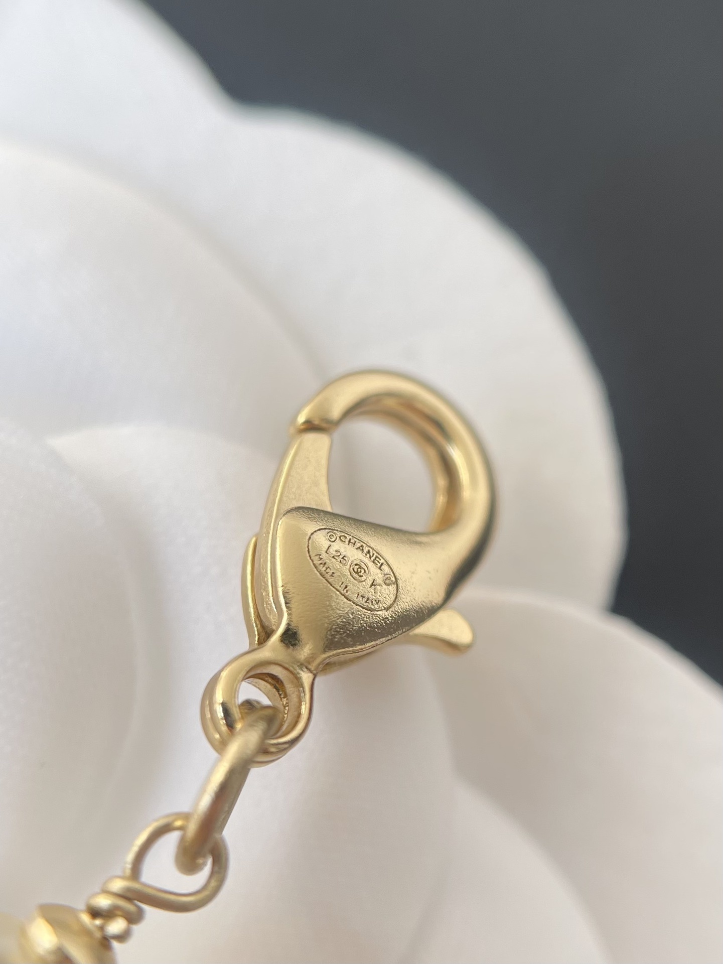 To ensure that your Chanel Pearl Red Stone CC Necklace maintains its beauty and luster, it's important to follow a few simple care guidelines. Avoid exposing the necklace to harsh chemicals, such as perfumes, hairsprays, and cleaning agents. These substances can damage the pearls and stones, causing them to lose their shine. When not wearing the necklace, store it in a soft pouch or jewelry box to protect it from scratches and dust. Clean the necklace regularly with a soft, dry cloth to remove any dirt or fingerprints. If necessary, you can use a mild soap and water solution to gently clean the pearls and stones, but be sure to rinse thoroughly and dry completely before storing.