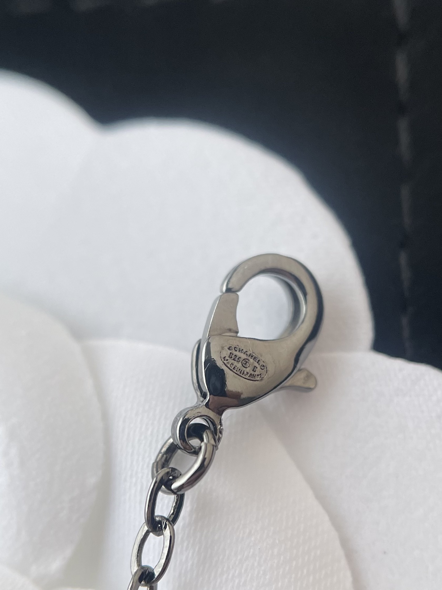 Chanel Pink Resin Necklace - Elevate your style with the exquisite Chanel Pink Resin & Silver Metal Necklace, a stunning piece that embodies elegance and charm. This necklace seamlessly blends the classic sophistication of Chanel with a modern, playful twist, making it a must-have accessory for any fashion-forward individual. The delicate pink resin detail, paired with the lustrous silver metal, creates a harmonious balance that is both eye-catching and refined. This Chanel necklace is more than just an accessory; it's a statement of timeless beauty and unparalleled craftsmanship. The centerpiece is a round pendant featuring the iconic Chanel logo, delicately embedded in pink resin and surrounded by sparkling crystals, adding a touch of glamour and femininity.