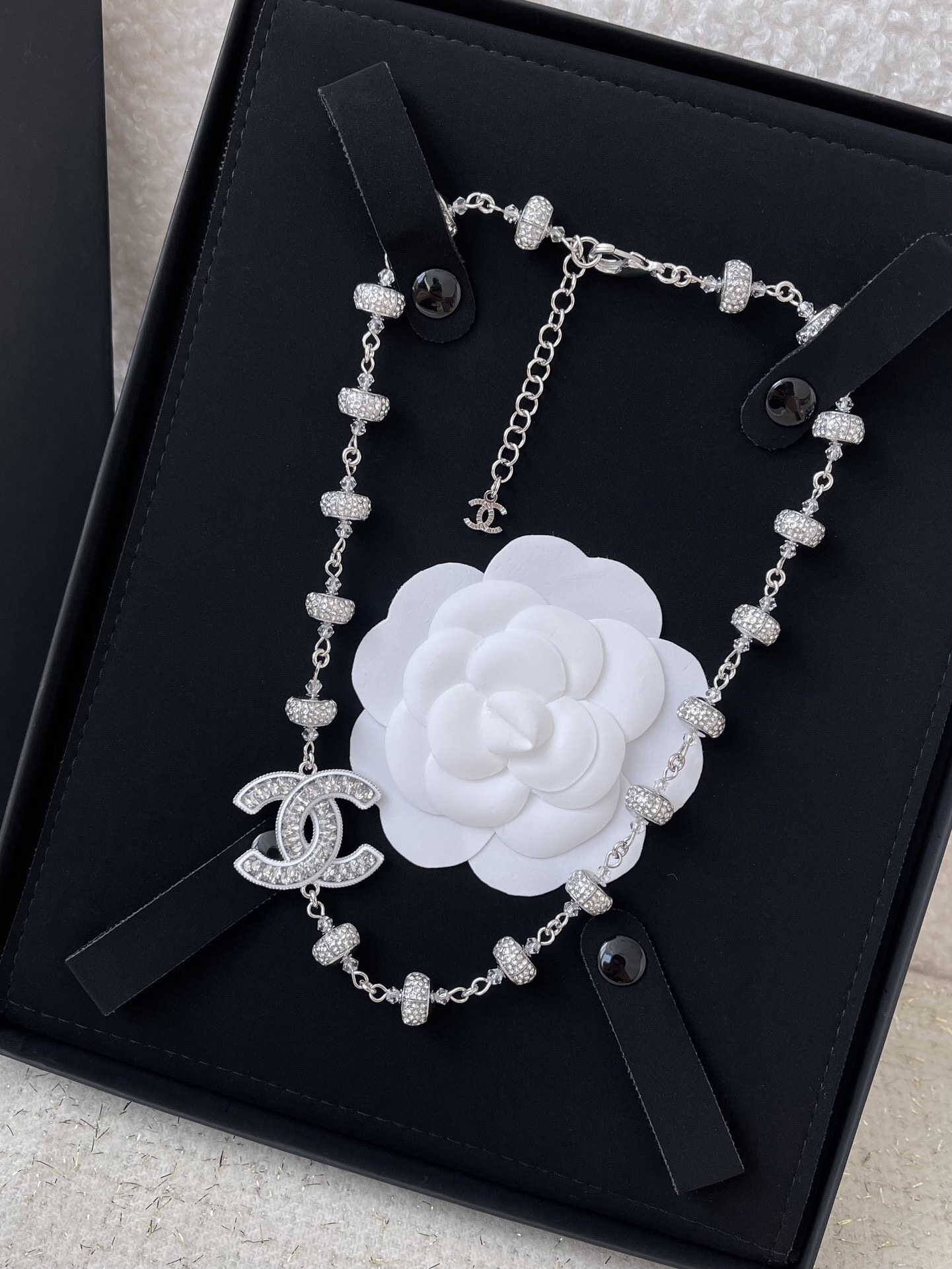 Regularly inspect the necklace for any loose crystals or damage, and have it professionally repaired if necessary. With proper care, your Chanel Silver Crystal CC Ball Necklace will continue to shine and sparkle for years to come, bringing joy and elegance to your wardrobe.
