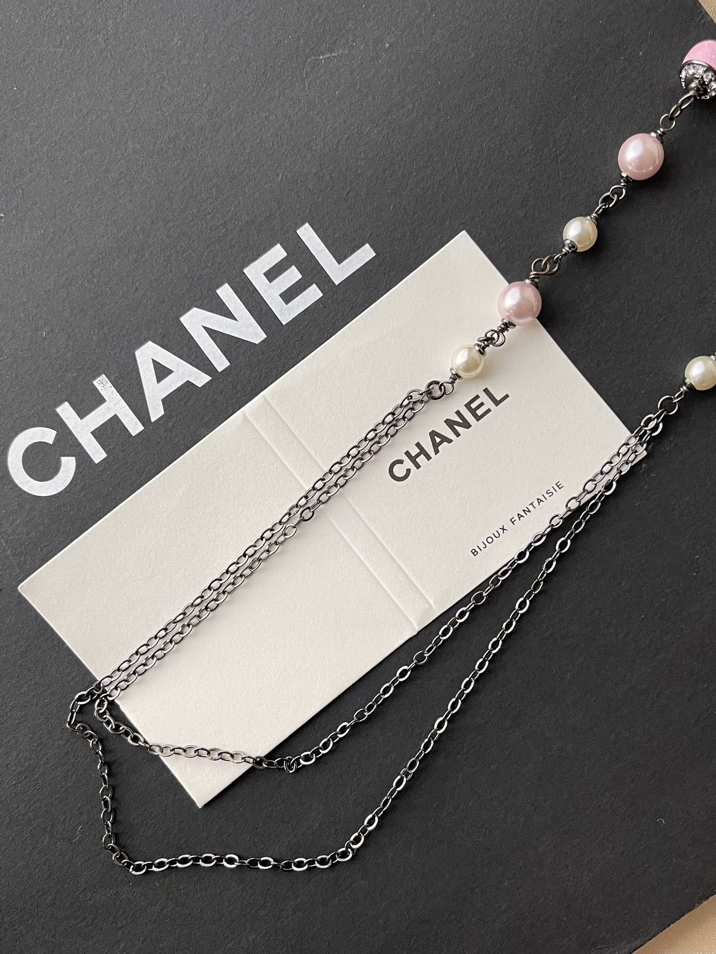 - Introducing the Chanel Silver Pink Pearl Long Necklace
