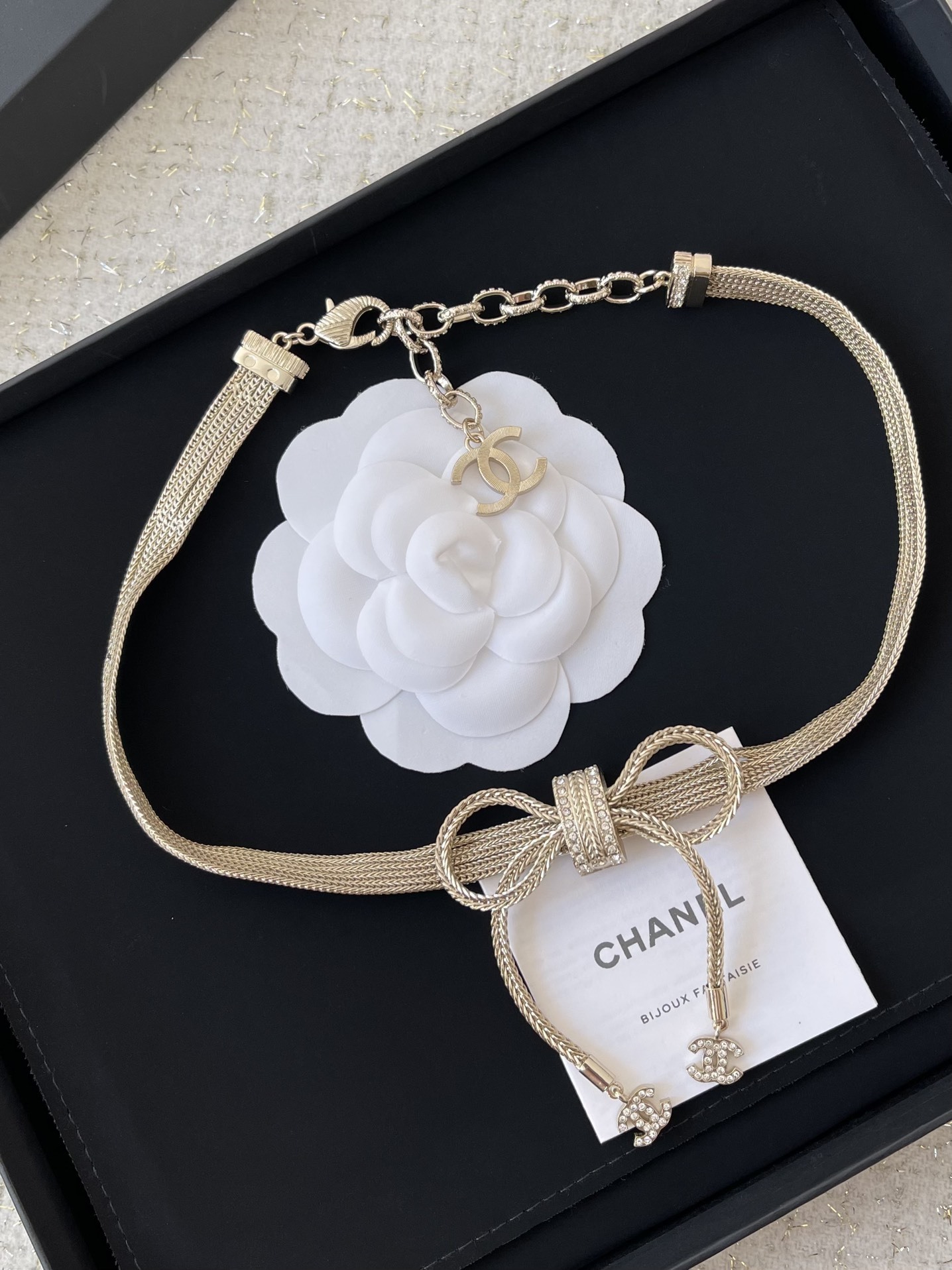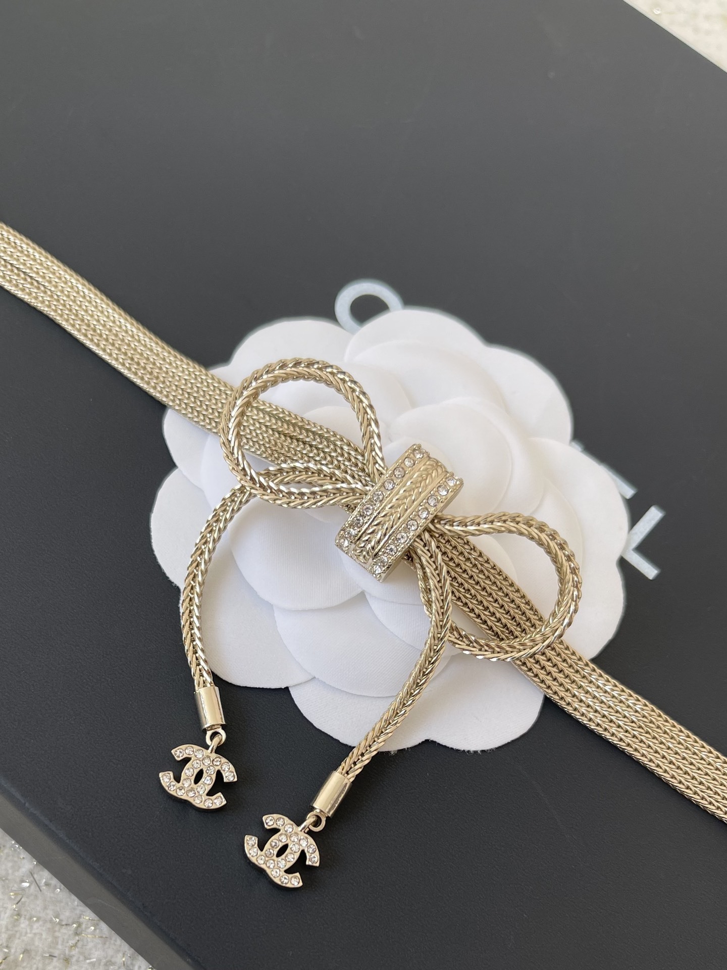 Avoid exposing the necklace to excessive moisture, such as when showering or swimming. Remove the necklace before applying lotions, perfumes, or hairsprays, as these can damage the silver finish and rhinestones. By following these simple guidelines, you can ensure that your Chanel Silver Ribbon Choker Necklace remains a beautiful and cherished piece in your jewelry collection.