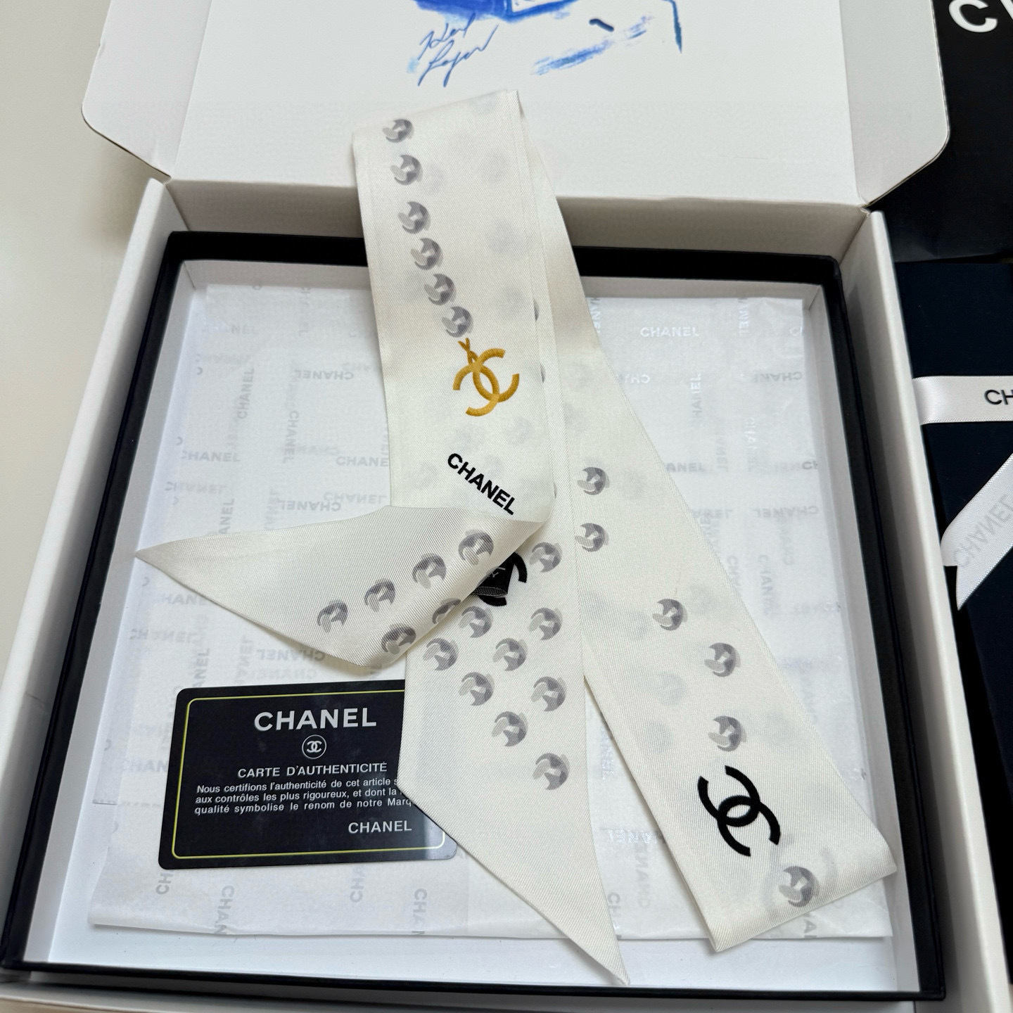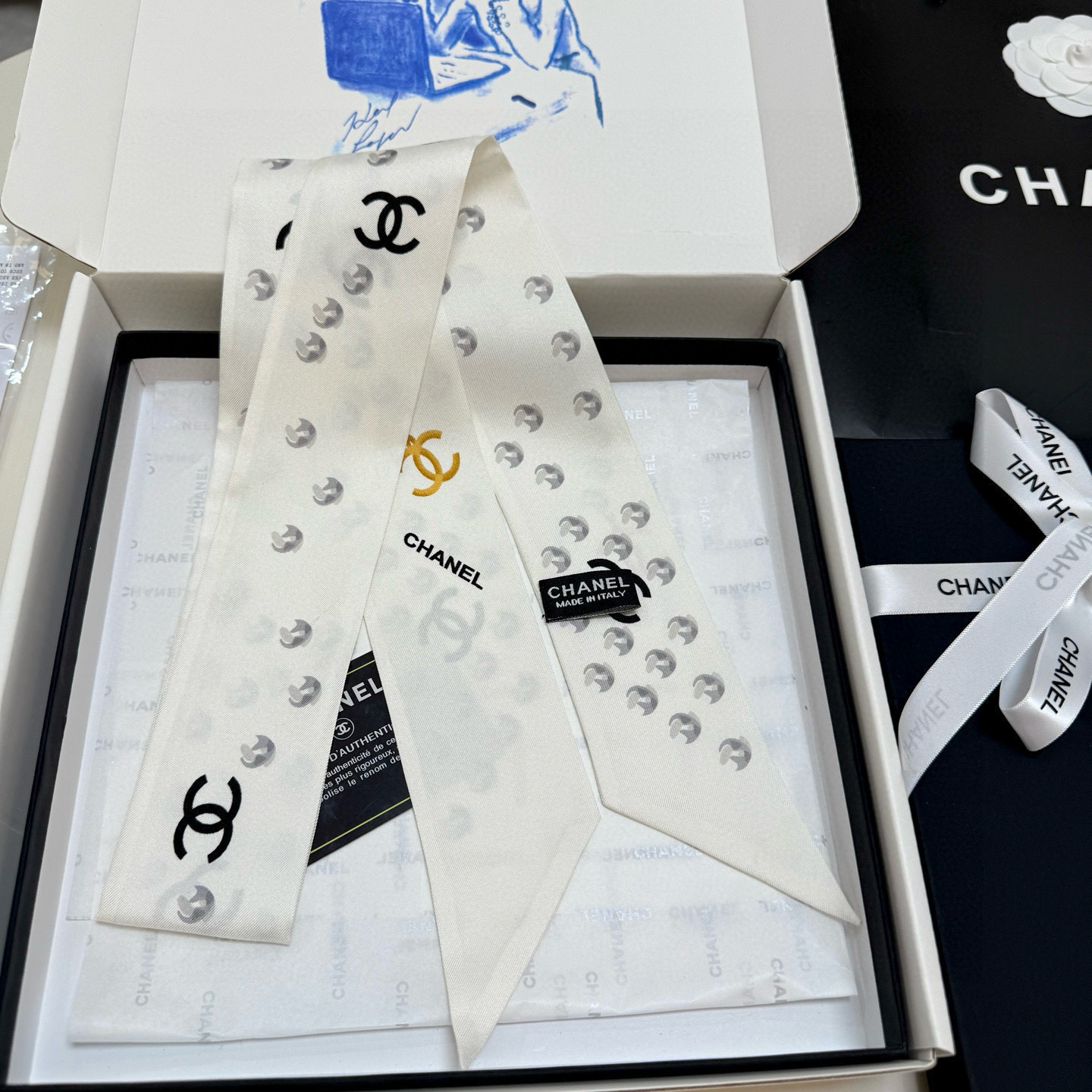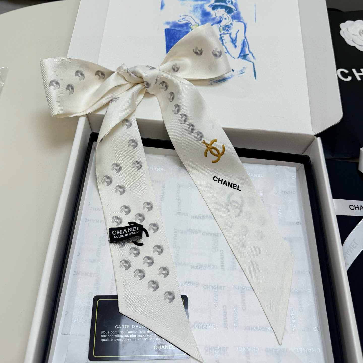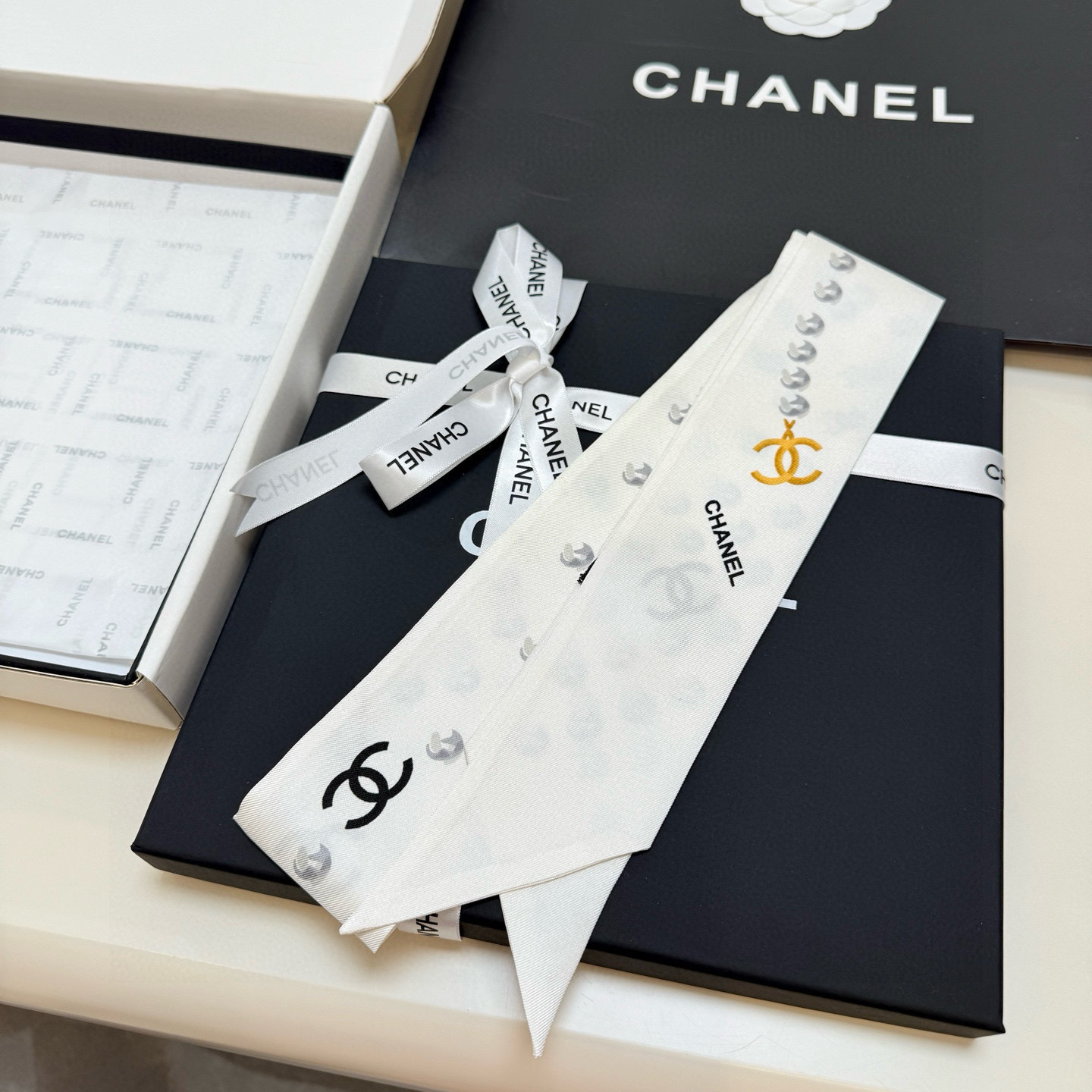 The iconic CC logo, synonymous with Chanel's heritage and prestige, is prominently featured on the scarf. This emblem serves as a mark of authenticity and a symbol of timeless style. The scarf's elongated design allows for versatile styling options, whether you choose to wear it around your neck, tie it to your handbag, or style it as a headband.