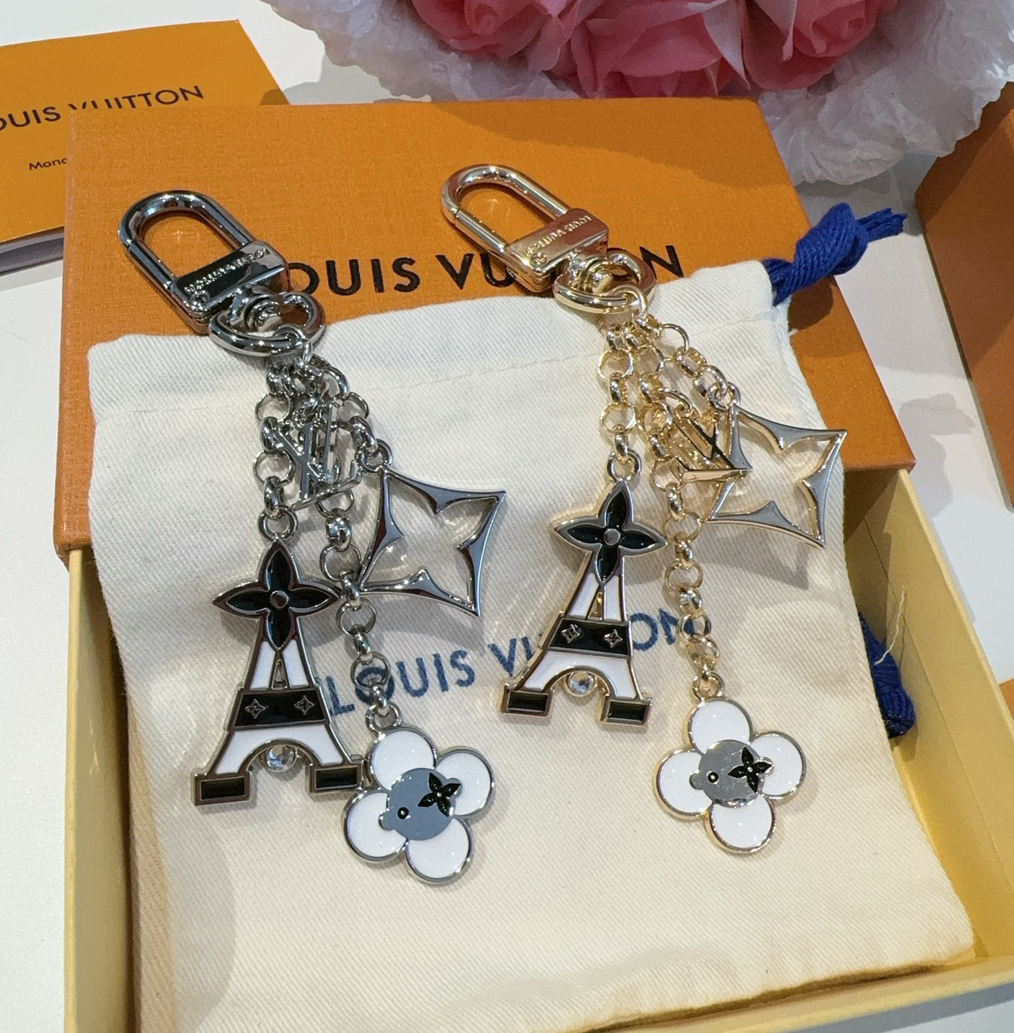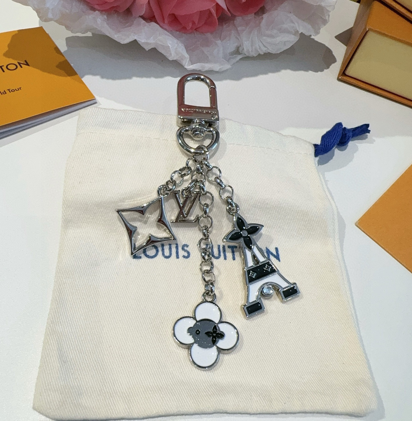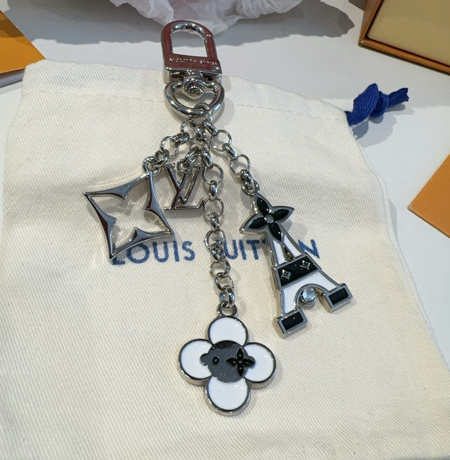 charm Louis Vuitton Silver Keychain - Elevate your everyday style with the Louis Vuitton Silver Charm Keychain, a sophisticated accessory that blends iconic designs with practical functionality. This exquisite keychain features a collection of meticulously crafted charms, including the emblematic Louis Vuitton flower and a miniature Eiffel Tower, all rendered in polished silver. The intricate detailing and high-quality materials make this keychain a standout piece, perfect for adding a touch of luxury to your keys, bags, or accessories.