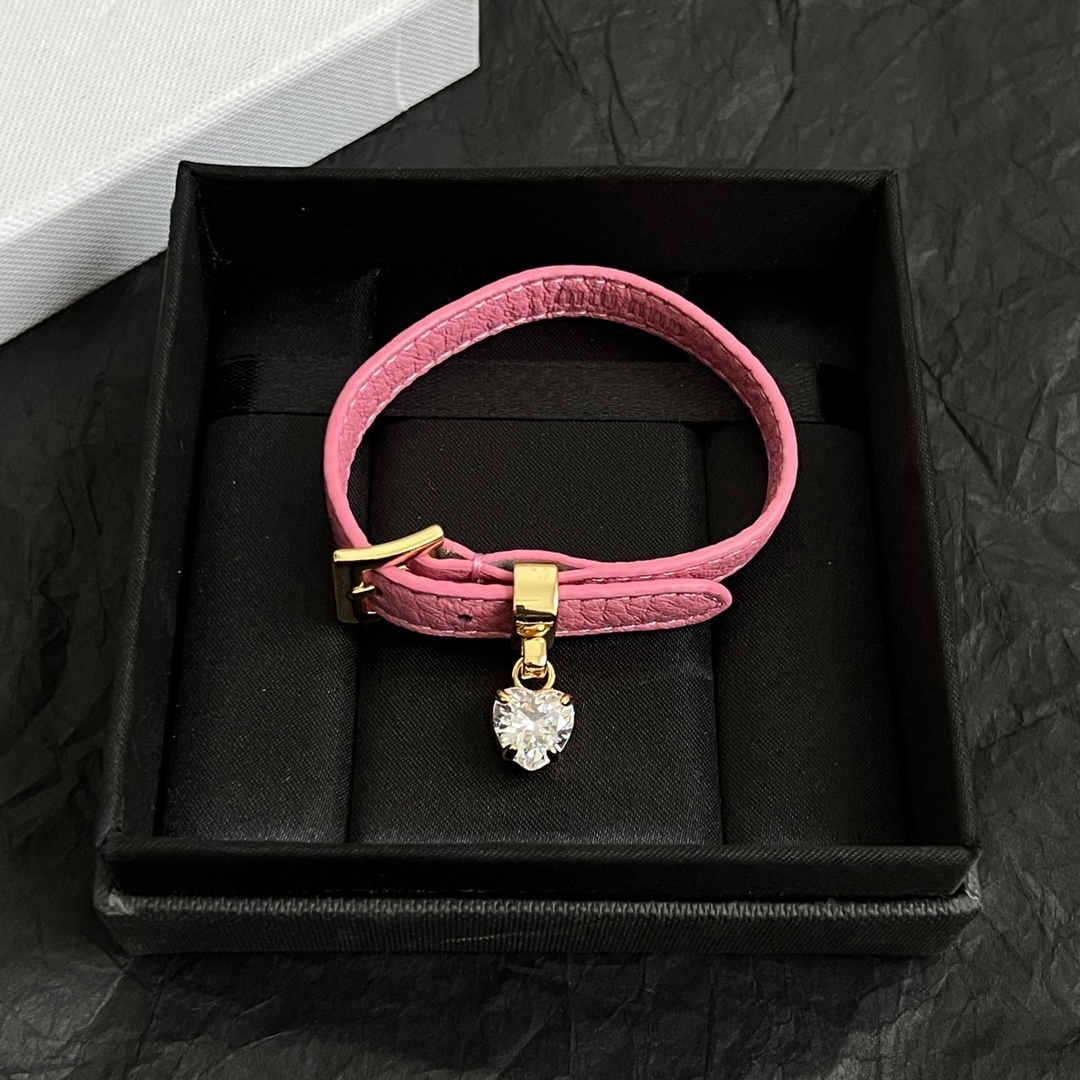 charm Miu Miu Leather Heart Bracelet - Elevate your wrist game with the exquisite Miu Miu Leather Heart Charm Bracelet. This charming bracelet features a delicate leather strap in either a playful pink or a serene blue, adorned with a sparkling heart-shaped charm. It’s the perfect accessory to add a touch of whimsy and elegance to any outfit. The Miu Miu Leather Heart Charm Bracelet is more than just a piece of jewelry; it's a statement of your unique style and appreciation for high-end fashion. It is ideal for those who love to express their personality through accessories.