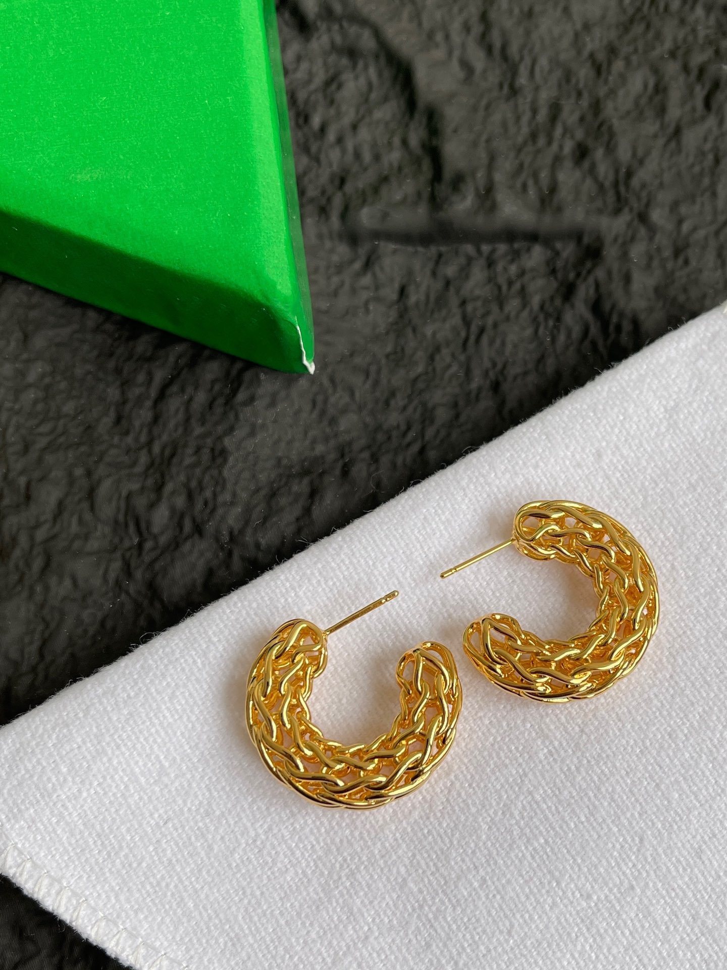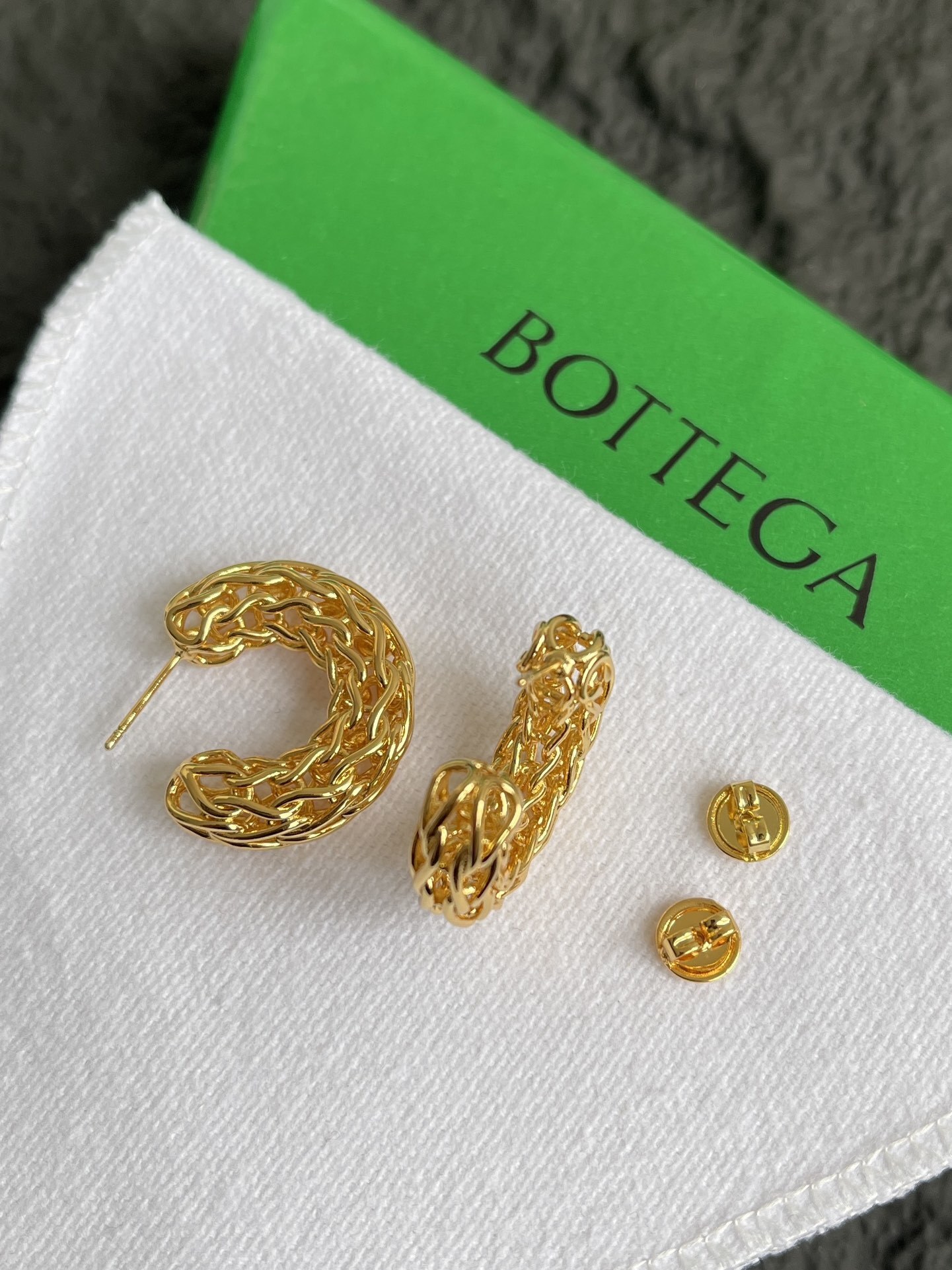 chic Bottega Veneta Gold Woven Hoop Earrings - Elevate your style with the exquisite Bottega Veneta Gold Woven Hoop Earrings. These stunning earrings feature a unique woven design in luxurious gold, embodying the craftsmanship and elegance that Bottega Veneta is renowned for. Perfect for adding a touch of sophistication to any outfit, these hoops are a must-have accessory for the modern woman. The intricate detailing and high-quality materials make these earrings a timeless piece that you will cherish for years to come. Enhance your jewelry collection with these exceptional earrings that effortlessly blend classic design with contemporary flair. The **Bottega Veneta Gold Woven Hoop Earrings** are more than just an accessory; they're a statement.