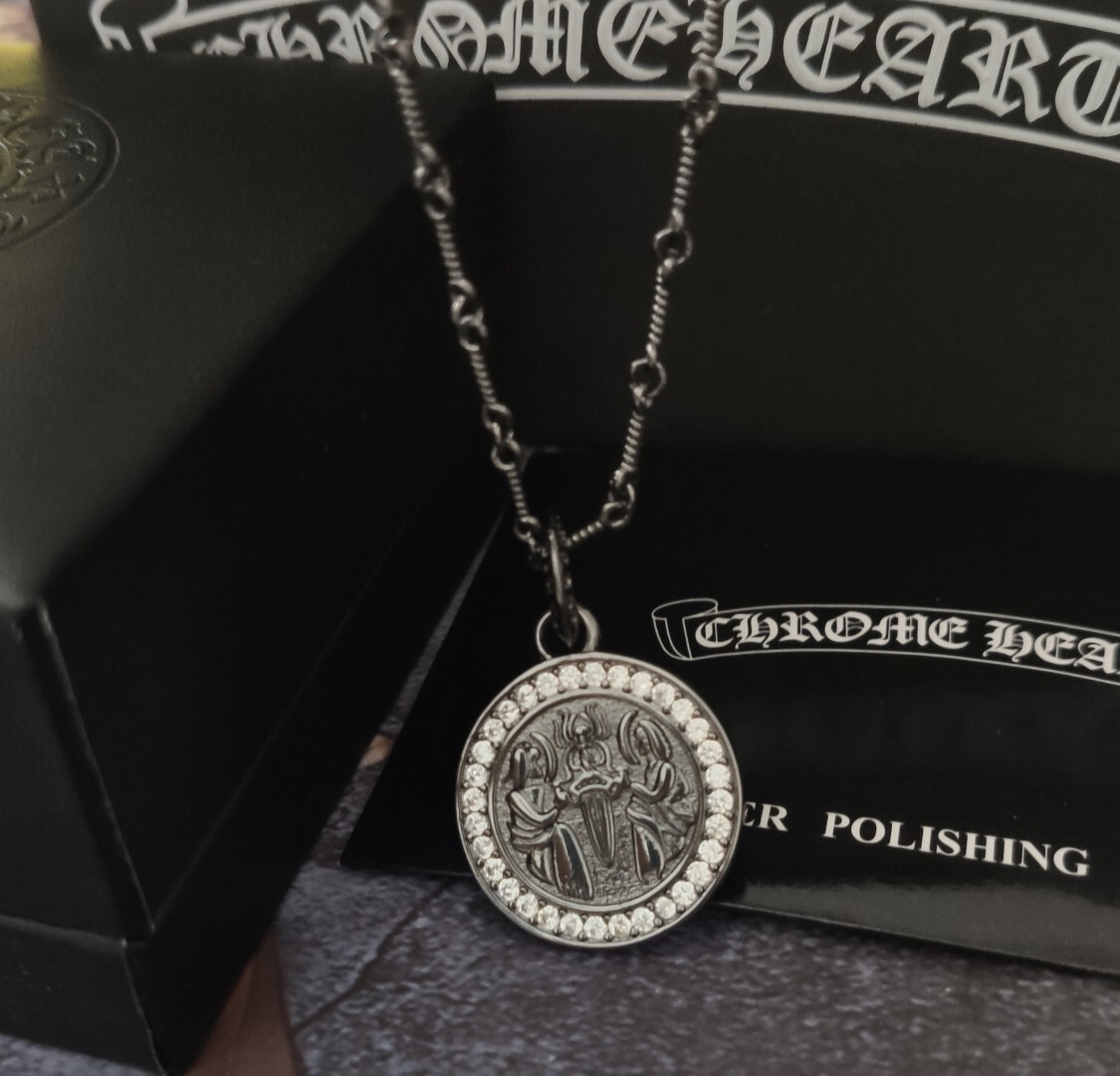 Elevate your style with the captivating Chrome Hearts Black Coin Pendant Necklace, a striking piece that seamlessly blends edgy aesthetics with refined elegance. This necklace features a unique coin pendant, meticulously crafted with a dark, blackened finish and adorned with a dazzling halo of crystals. The Chrome Hearts Black Coin Pendant Necklace is more than just an accessory; it's a statement of individuality and bold fashion sense. It’s a testament to the rebellious spirit and uncompromising quality that defines the Chrome Hearts brand. This necklace is perfect for those who appreciate distinctive design and want to add a touch of luxury to their everyday look. Whether you're dressing up for a special occasion or adding an edge to your casual attire, this pendant necklace is sure to turn heads and spark conversations.