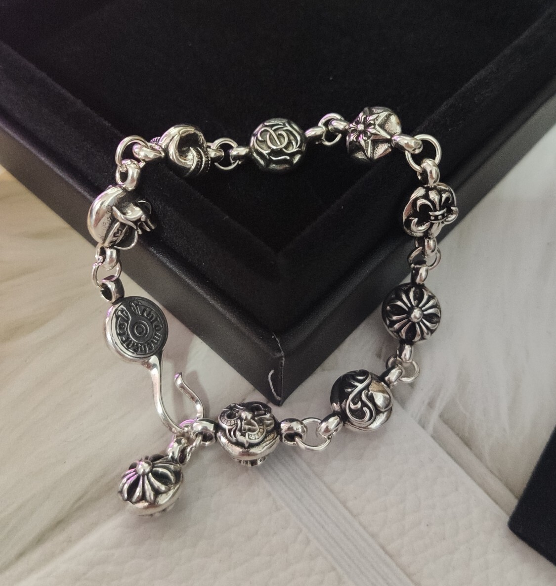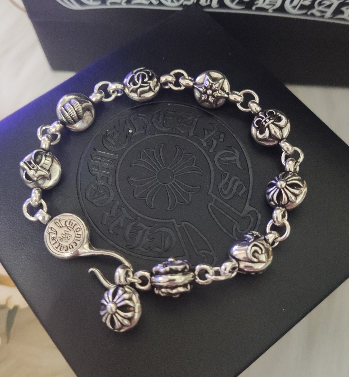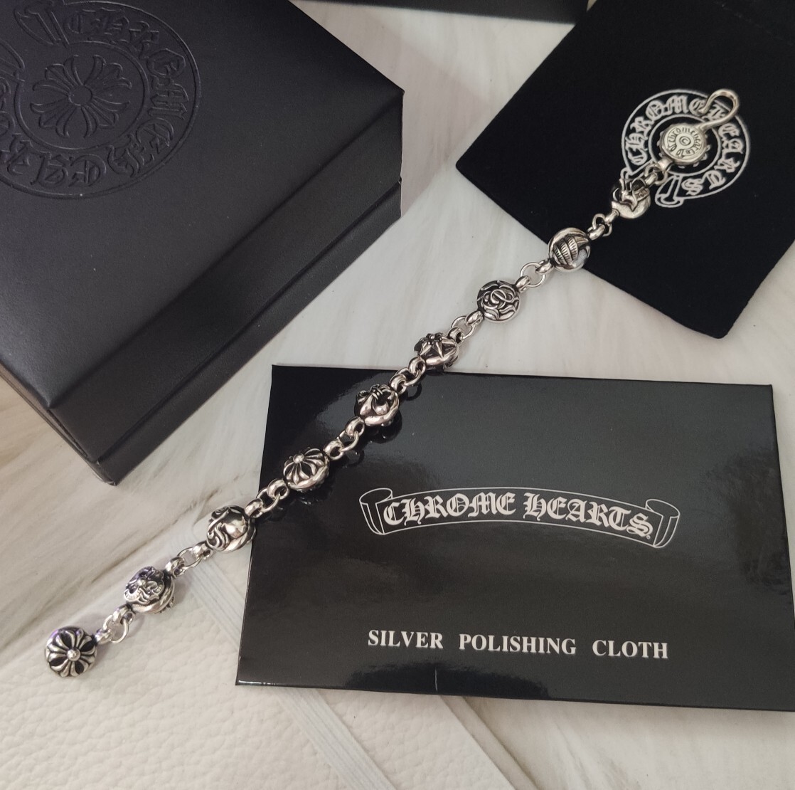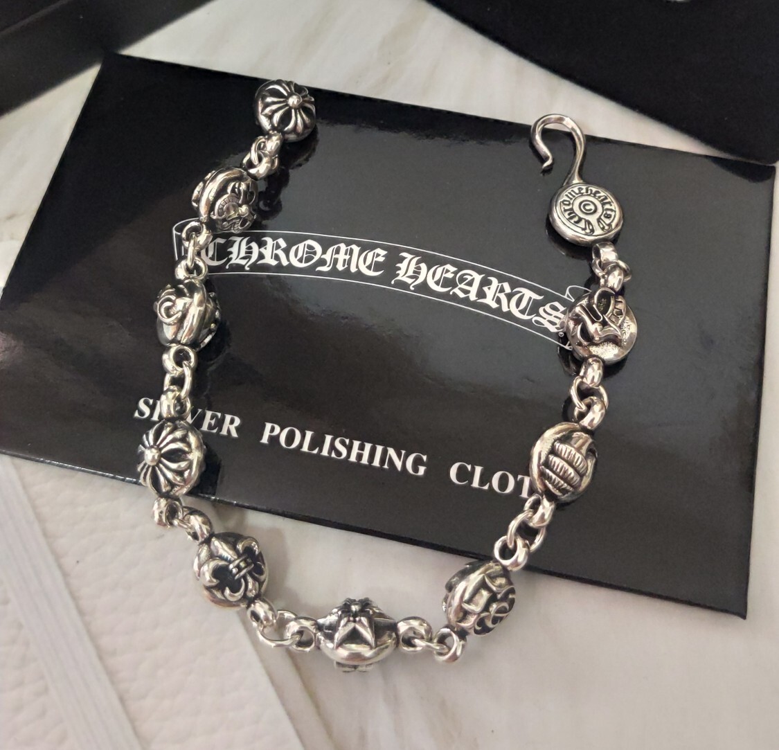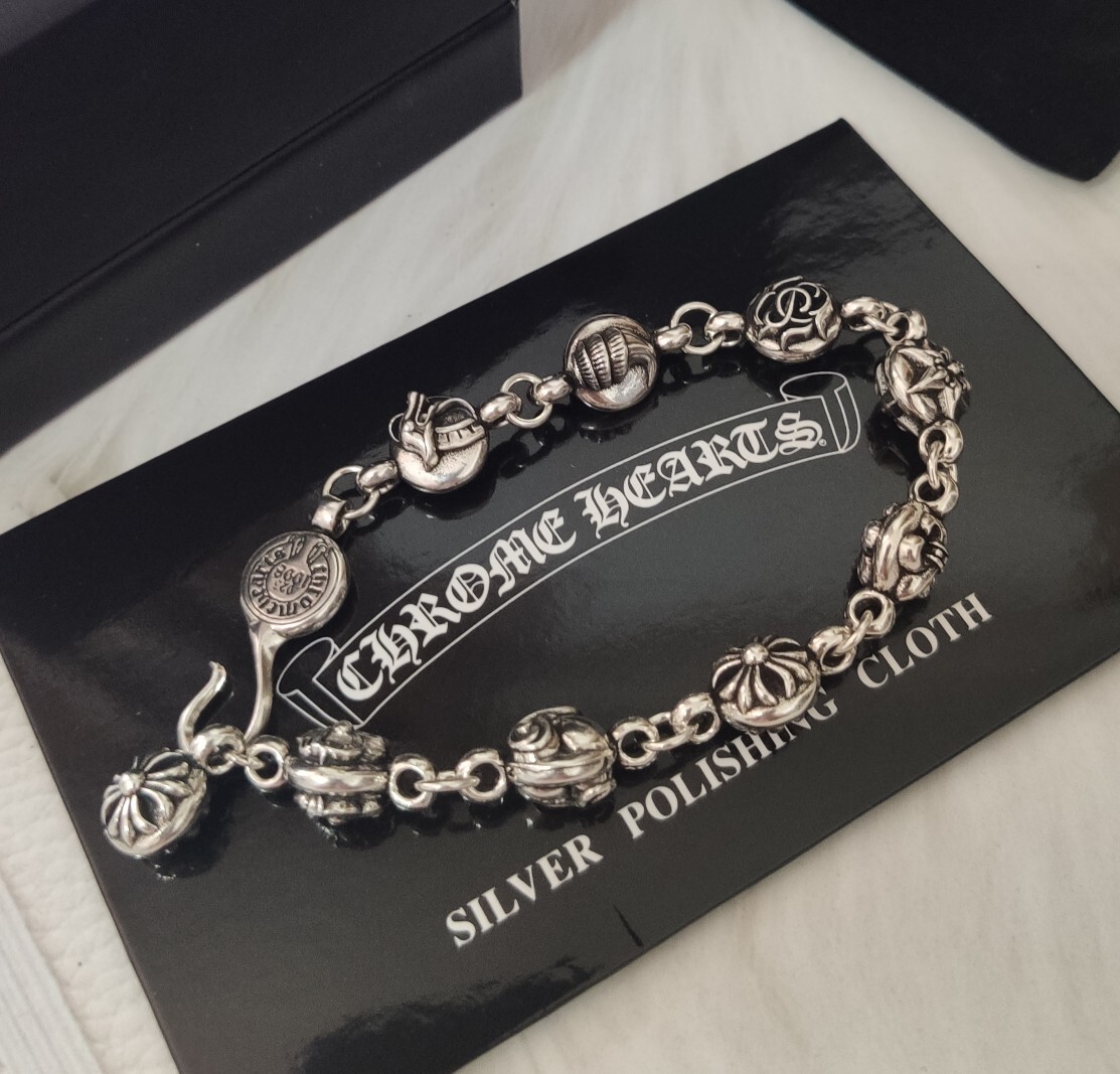 This bracelet showcases the iconic Chrome Hearts aesthetic, featuring a series of intricately designed sterling silver beads, each showcasing unique and symbolic motifs. The secure and stylish clasp adds a touch of sophistication while ensuring a comfortable and reliable fit. The bracelet's weight and feel speak to its premium quality and durability.