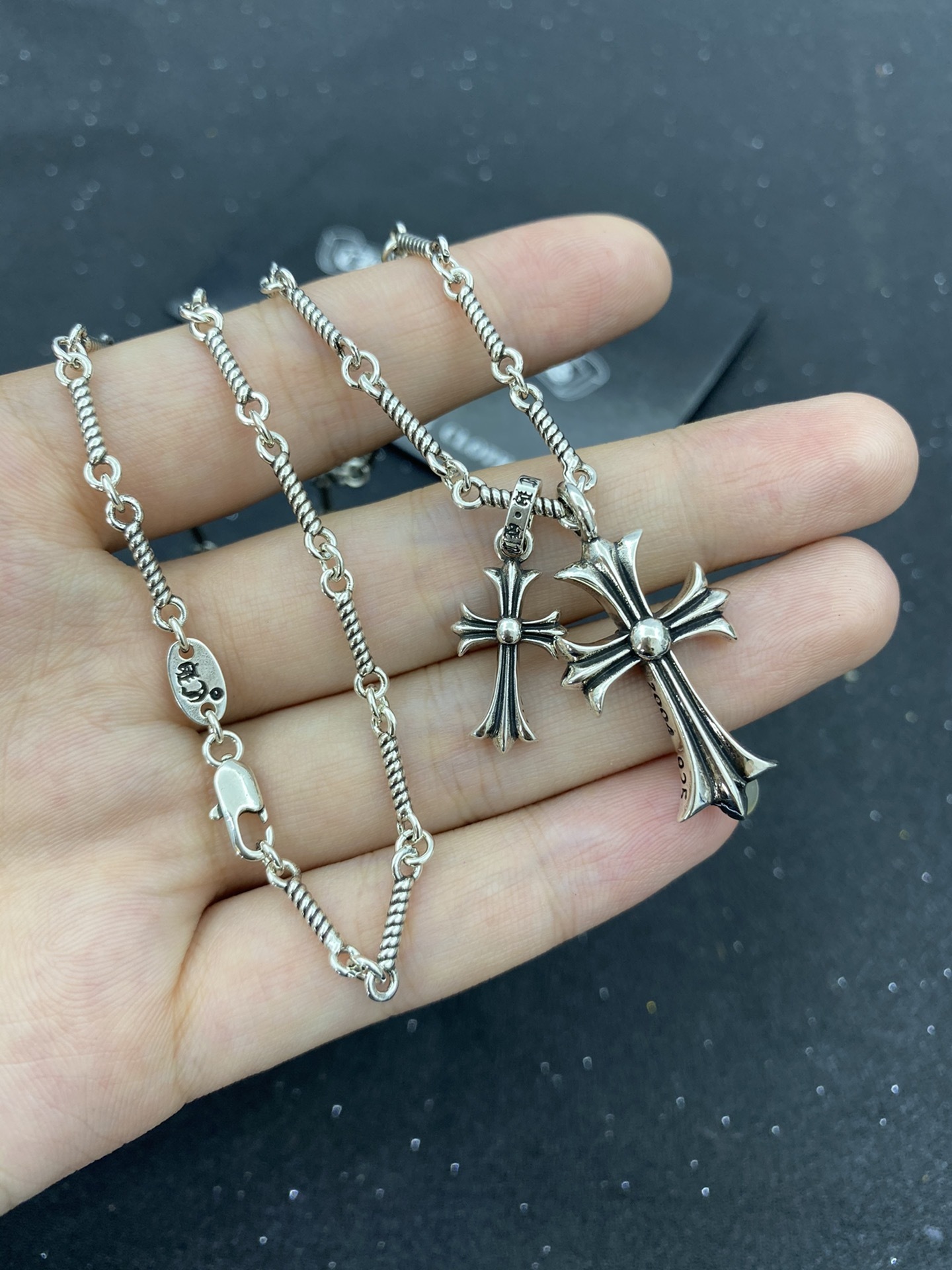 To care for your Chrome Hearts Diamond Cross Necklace, avoid exposing it to harsh chemicals and clean it regularly with a soft, lint-free cloth. Store the necklace in a jewelry box or pouch to protect it from scratches and tarnish. For the diamonds, gently clean them with a soft brush and mild soap.