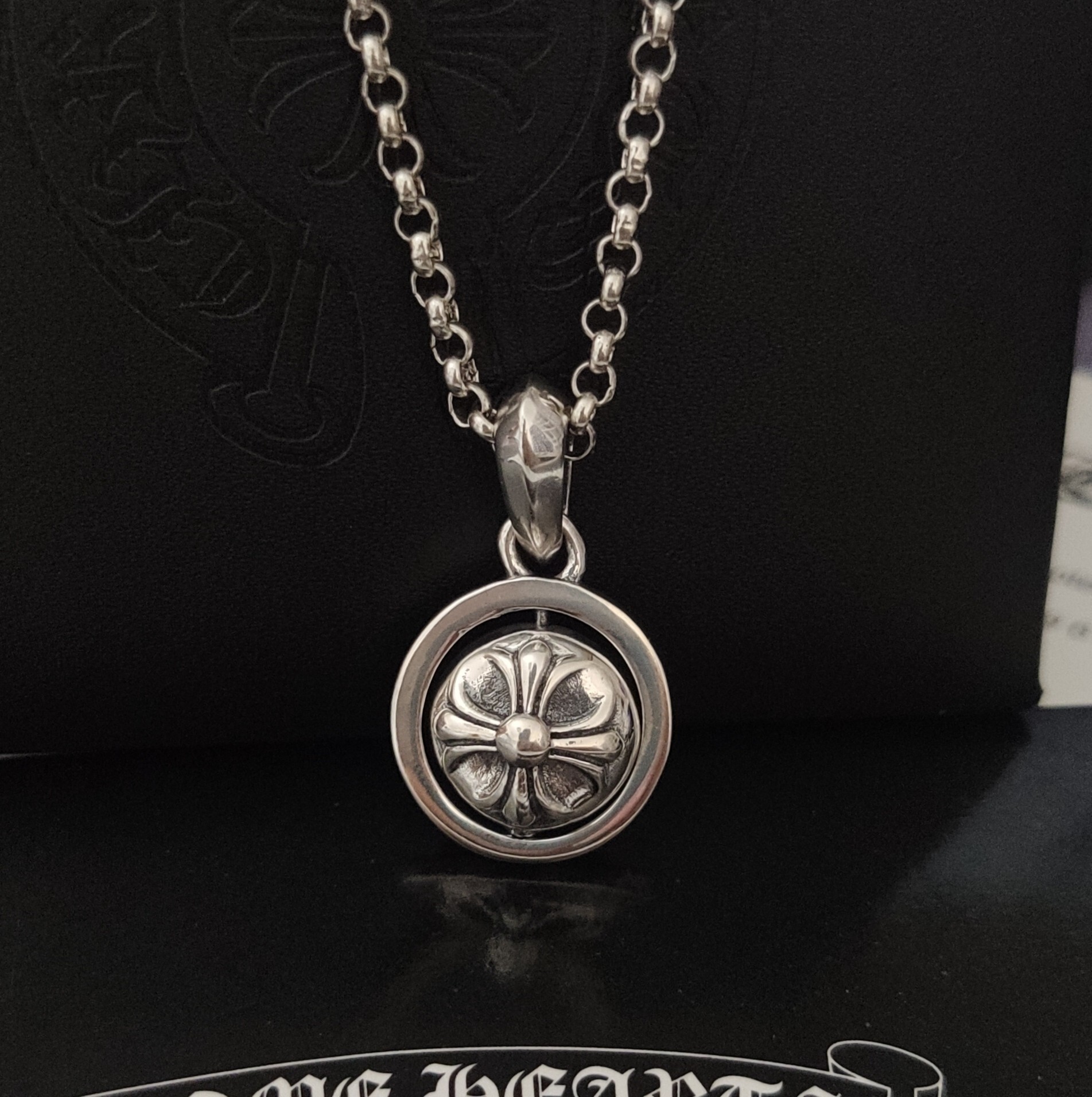 Chrome Hearts Floral Medallion - The Chrome Hearts Silver Floral Medallion Necklace is a stunning piece of jewelry that blends gothic aesthetics with intricate floral designs. This necklace is more than just an accessory; it's a statement piece that reflects individuality and a keen eye for unique craftsmanship. The medallion features a meticulously crafted floral motif encased in a circular frame, suspended from a delicate yet sturdy silver chain. This necklace is perfect for those who appreciate the artistry of Chrome Hearts and want to add a touch of edgy elegance to their style. Discover more about Chrome Hearts and their unique designs on product background on Wikipedia.