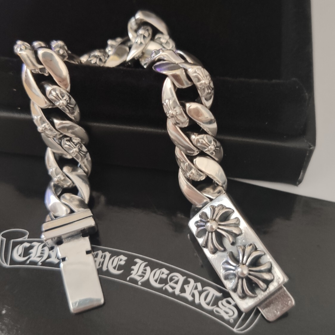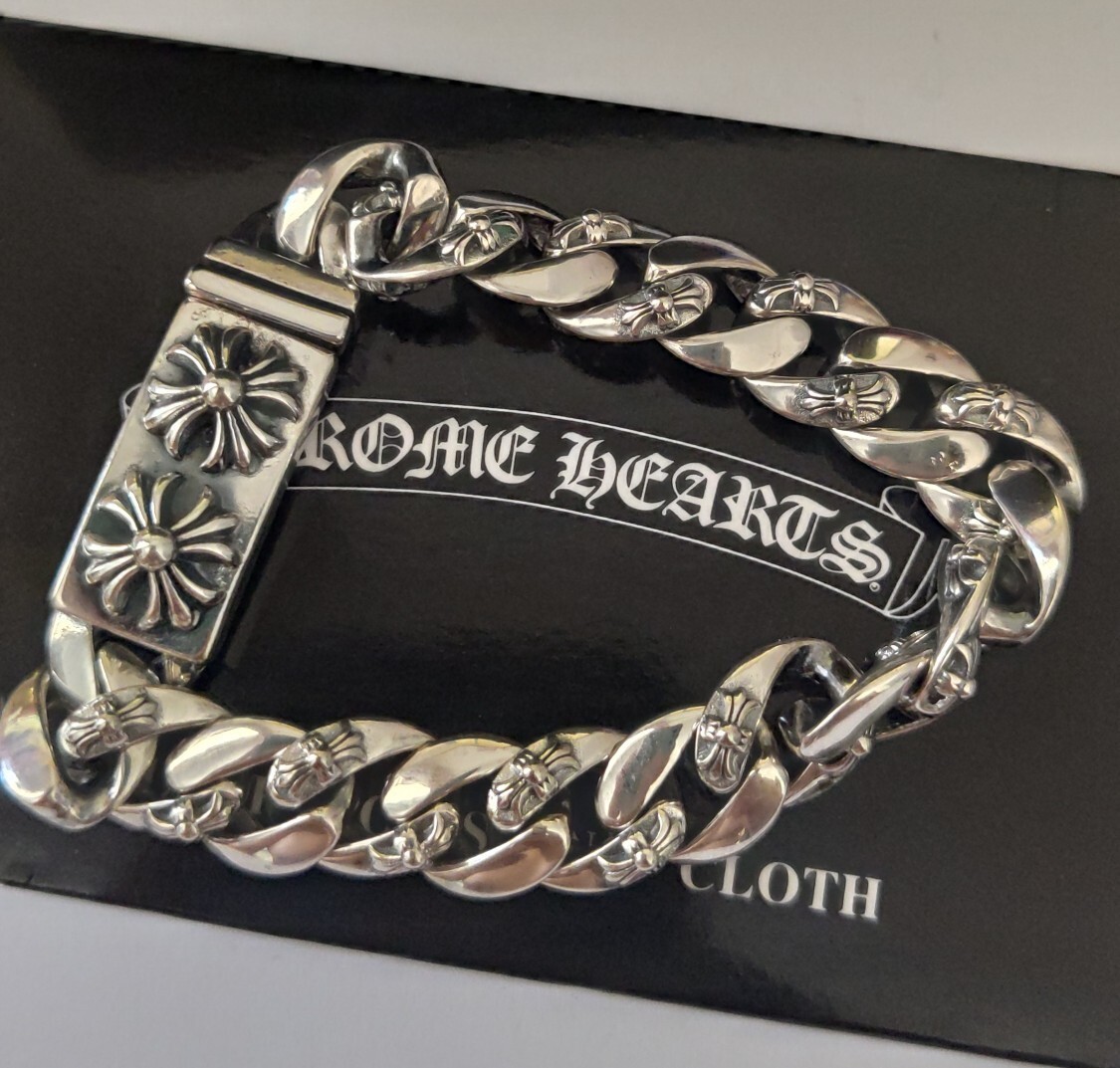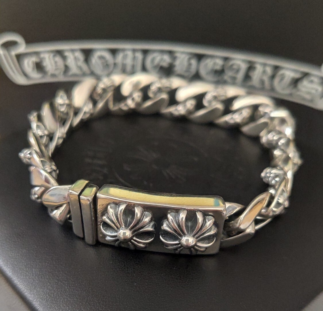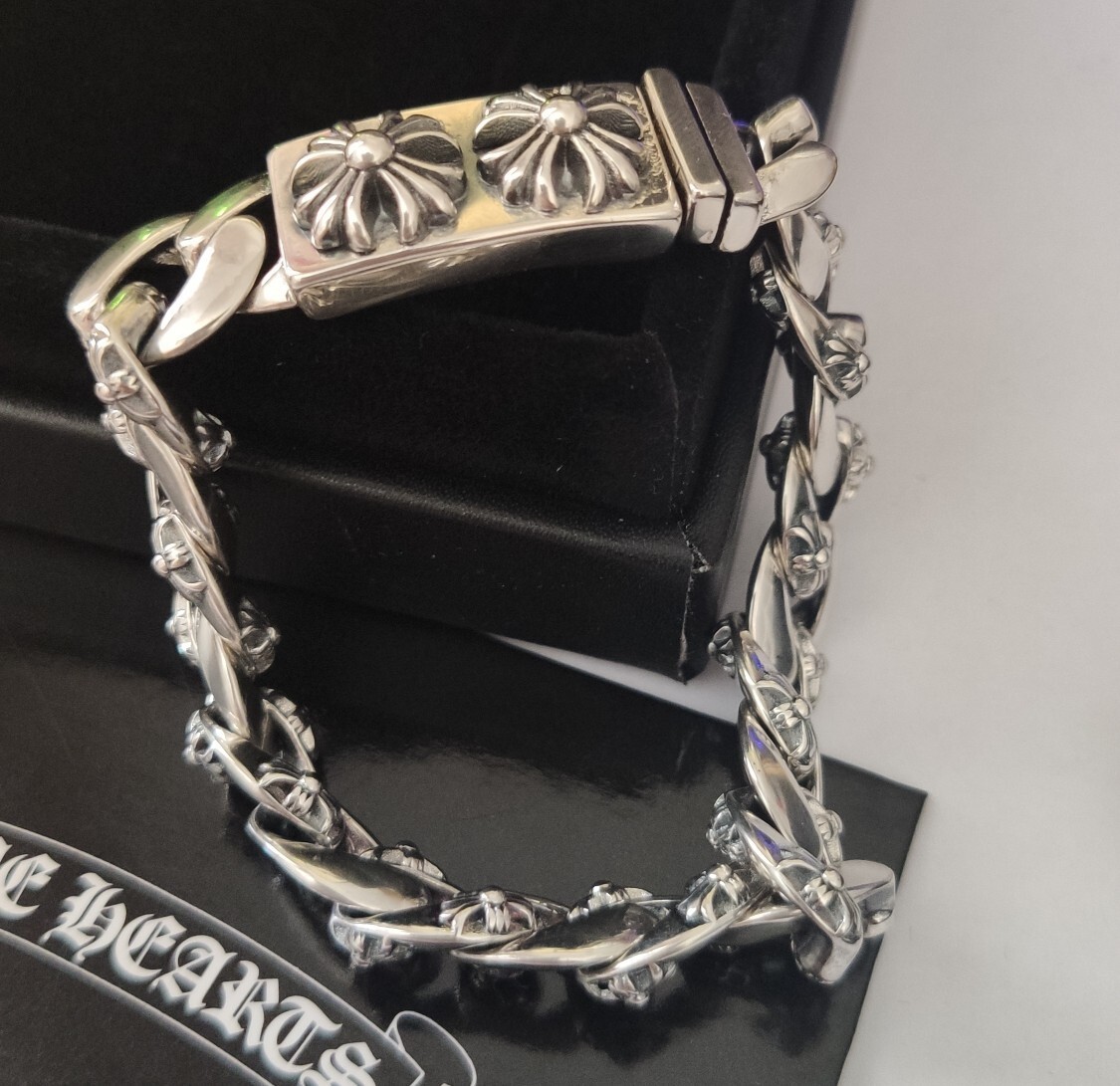 Our bracelet is expertly crafted using high-quality materials, ensuring durability and a lasting shine. The bold, interlocking links are adorned with intricate floral and cross motifs, capturing the iconic Chrome Hearts aesthetic. The secure clasp provides a comfortable and reliable fit.