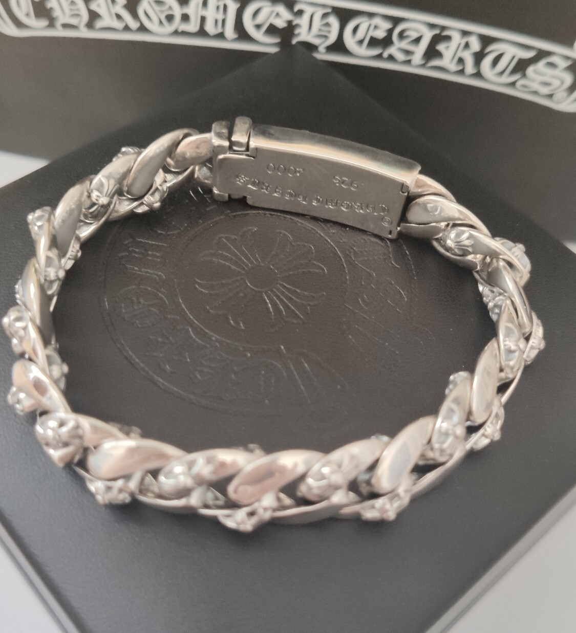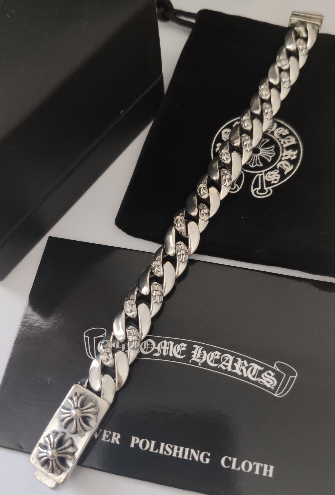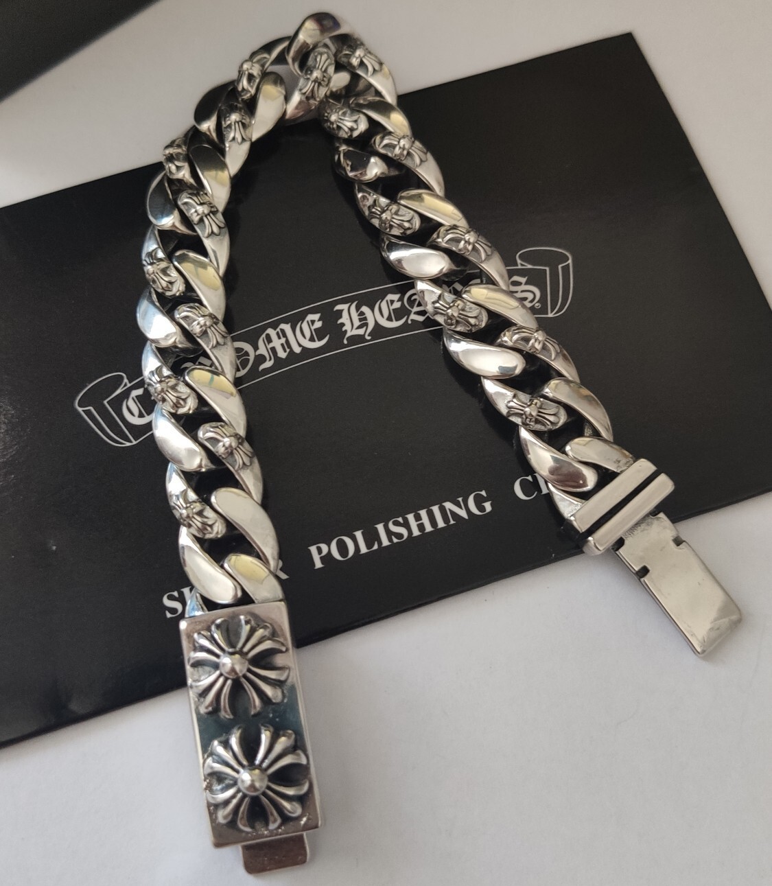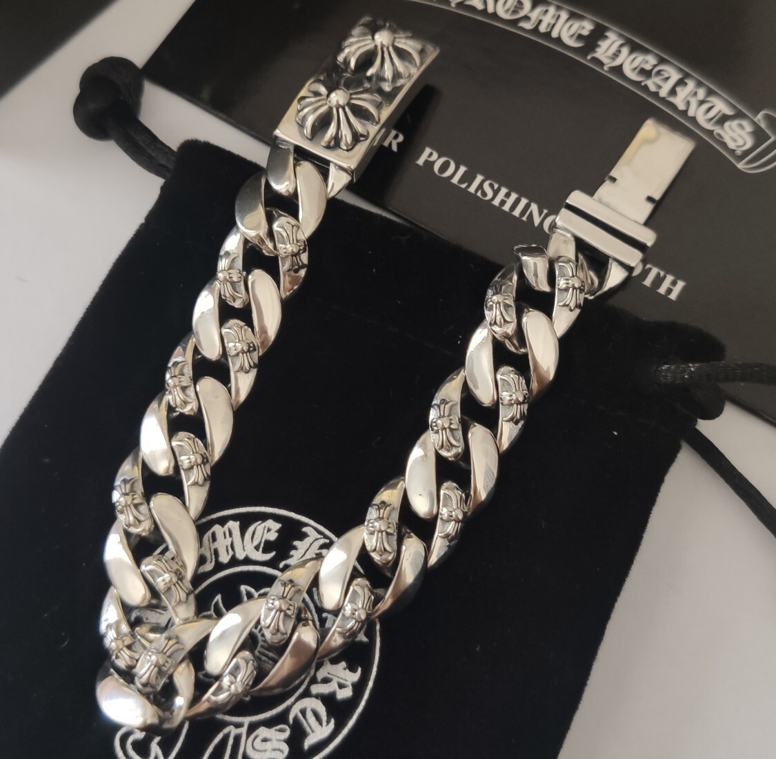 Our bracelet is expertly crafted using high-quality materials, ensuring durability and a lasting shine. The bold, interlocking links are adorned with intricate floral and cross motifs, capturing the iconic Chrome Hearts aesthetic. The secure clasp provides a comfortable and reliable fit.