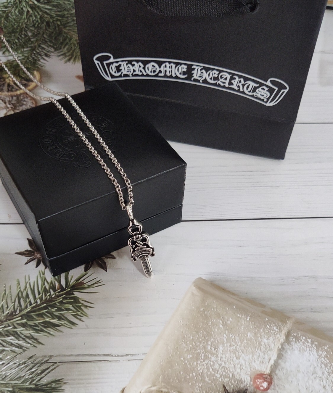 The necklace features a classic dagger pendant, a symbol of strength and individuality. The gothic design is complemented by the sleek silver finish, making it a versatile accessory that can be worn with various outfits. The pendant hangs from a sturdy yet elegant chain, ensuring a comfortable fit and secure wear. Whether you're dressing up for a special occasion or adding an edge to your everyday look, the Chrome Hearts Silver Dagger Pendant Necklace is the perfect choice.