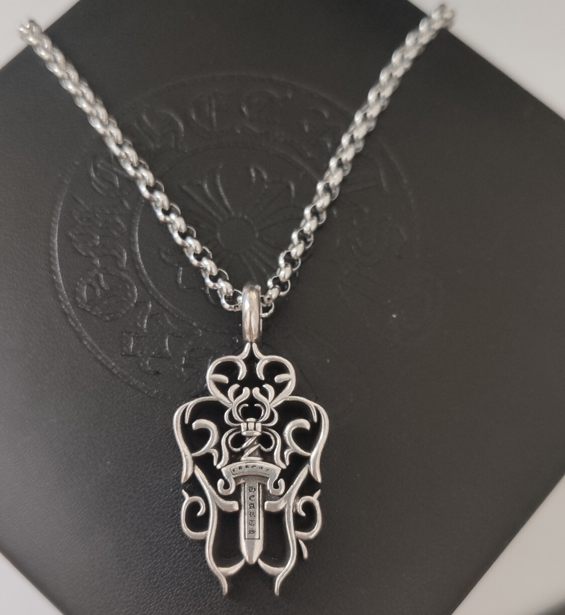 A: The pendant's intricate dagger design, high-quality sterling silver, and the iconic Chrome Hearts logo make it a distinctive and statement-making piece.