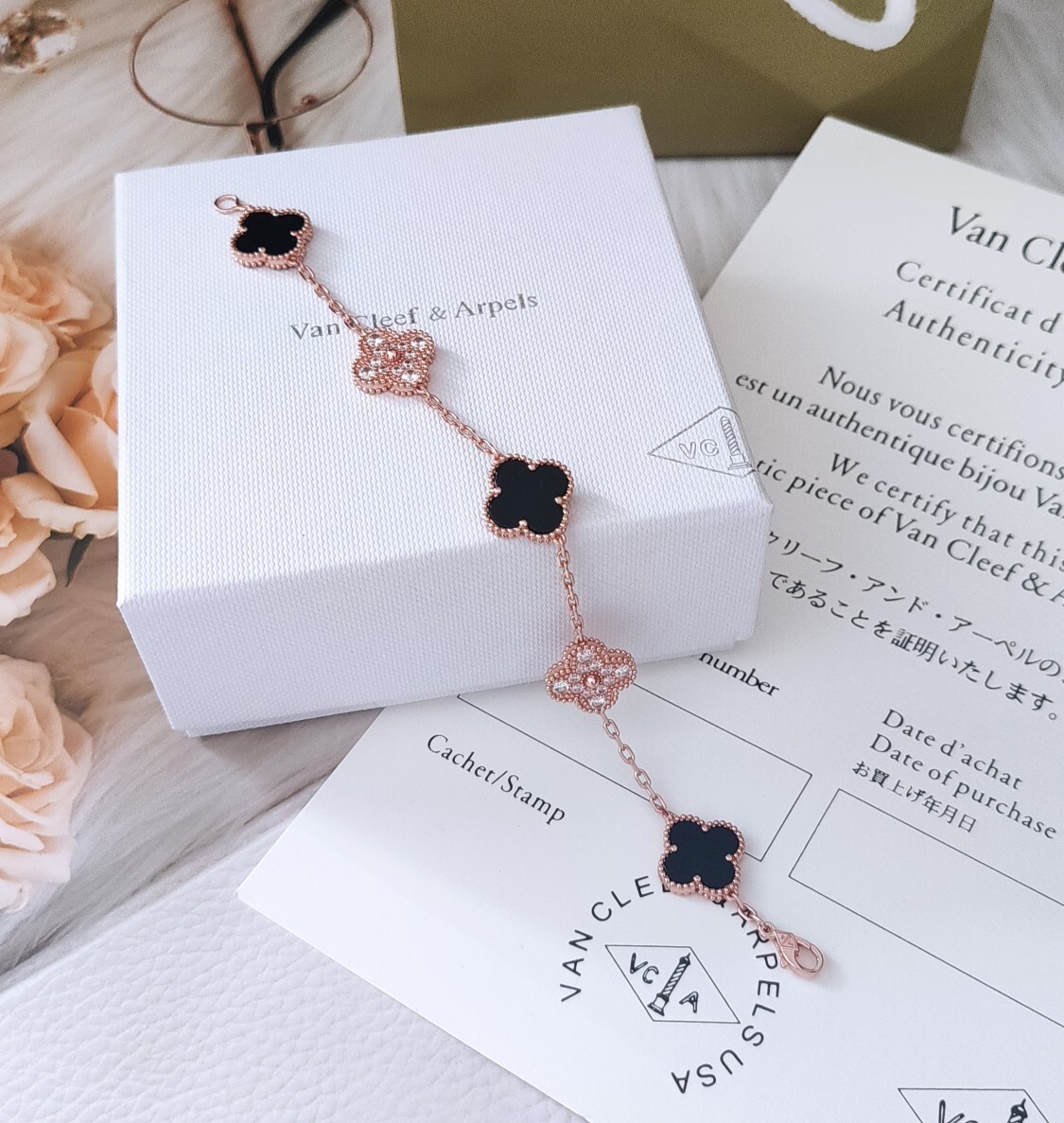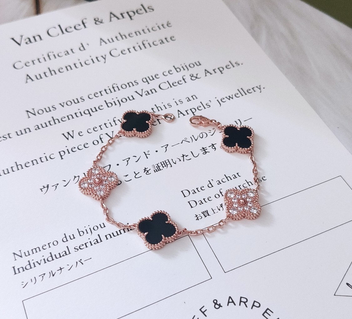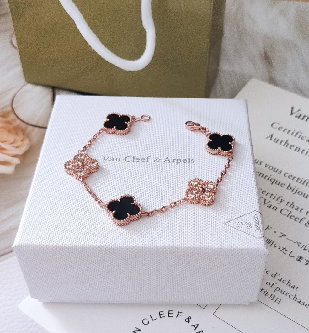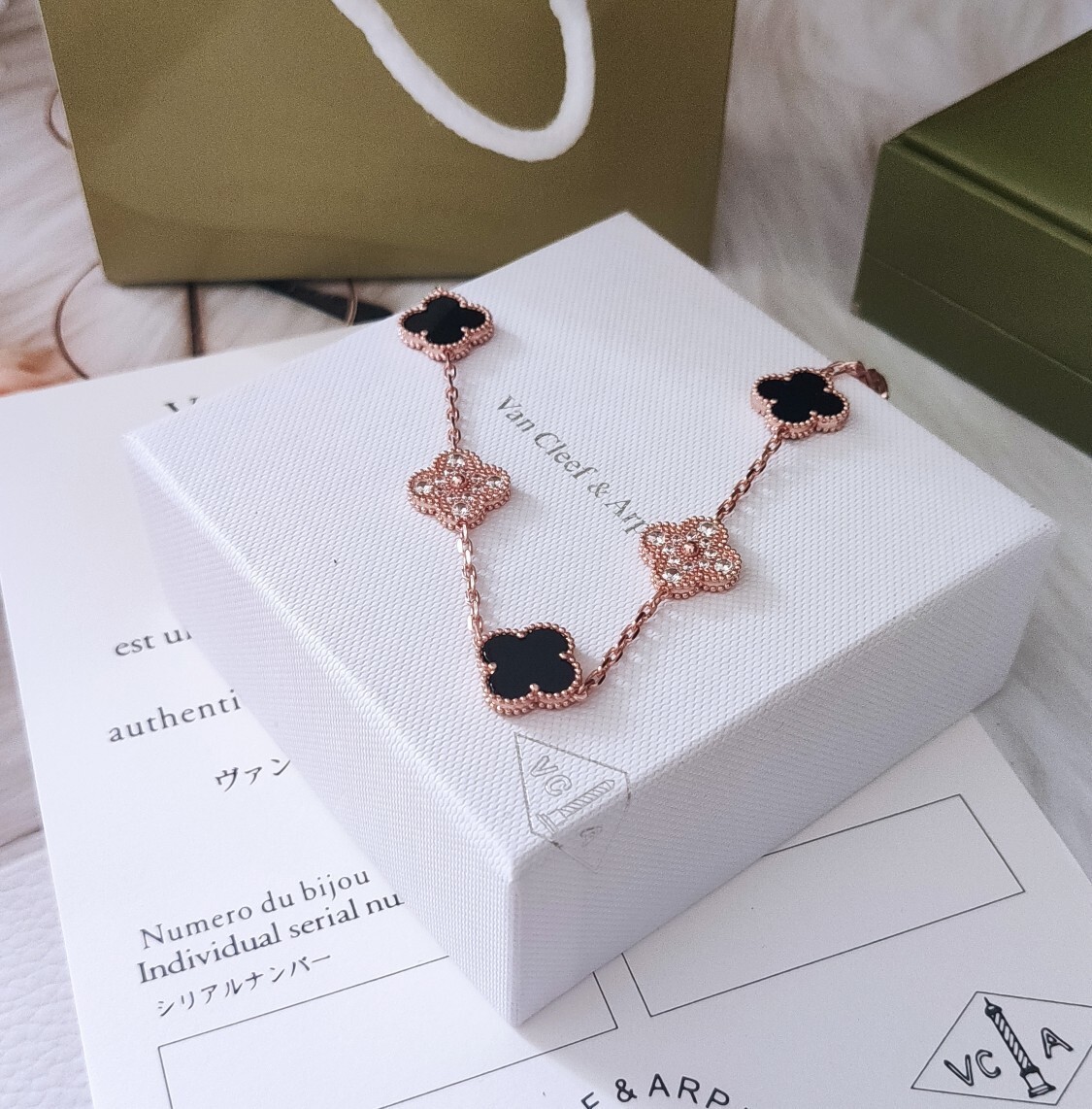 - Design: Features alternating clover motifs with black onyx and dazzling cubic zirconia, creating a captivating contrast.