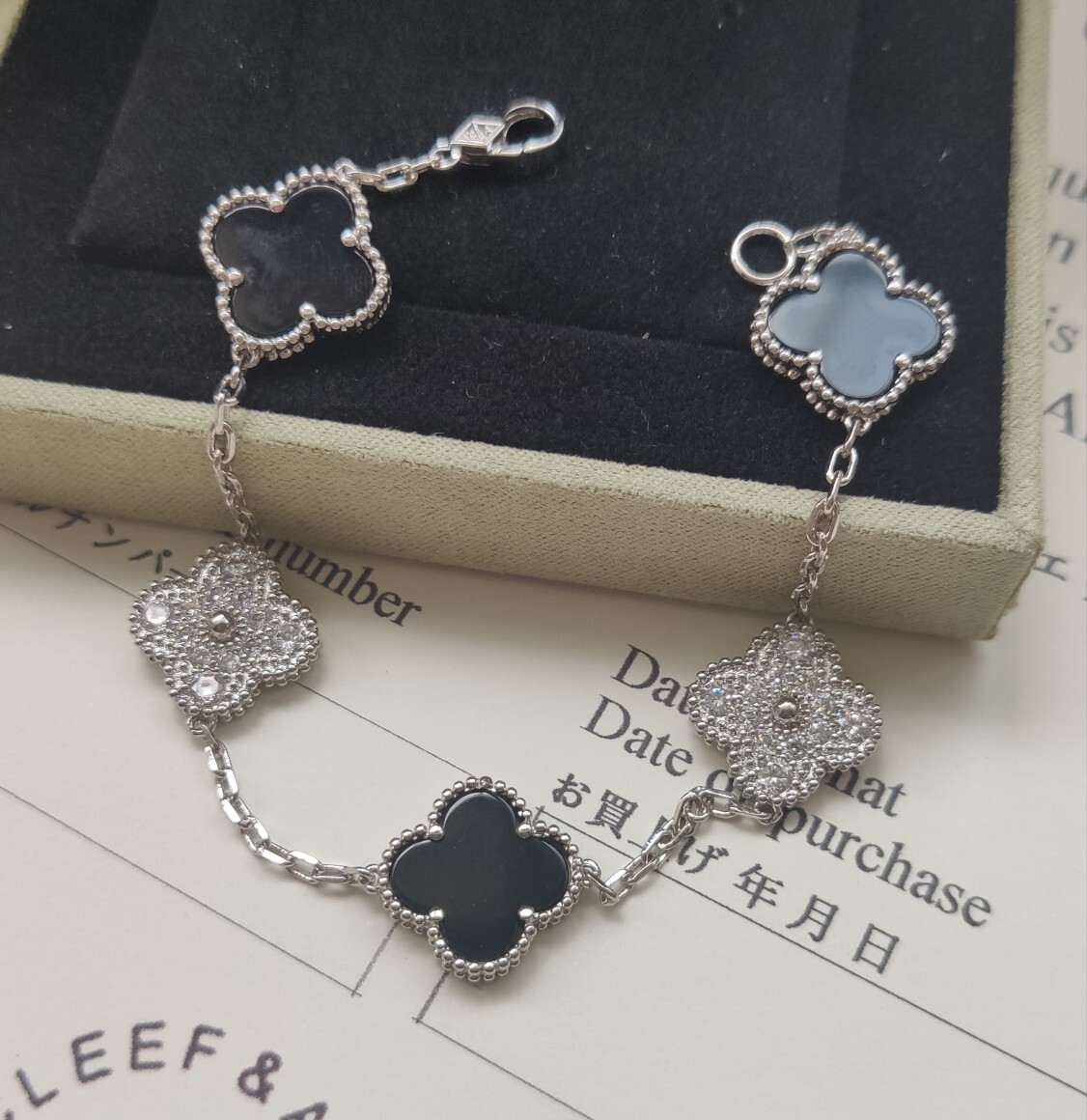 Indulge in the timeless beauty of our Premium Clover Bracelet. Meticulously crafted with sterling silver and adorned with striking onyx and sparkling crystal clovers, this bracelet is a statement of refined taste and enduring style. Each clover is carefully set to capture the light and enhance its natural allure, making it the perfect accessory for both everyday elegance and special occasions.