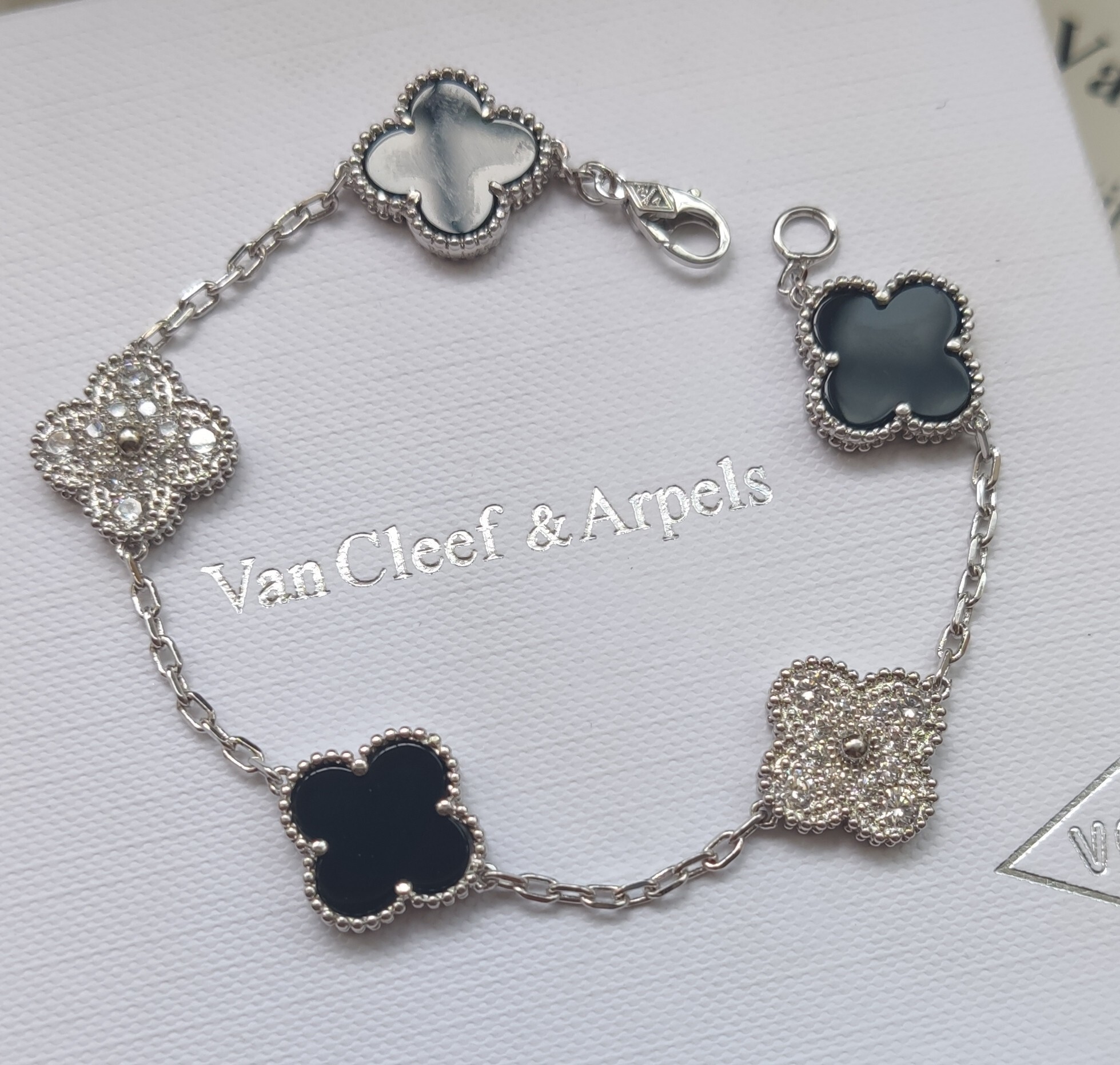 This bracelet features a delicate sterling silver chain that gracefully drapes around your wrist, showcasing five intricately designed clover charms. The alternating black onyx and shimmering crystal clovers create a captivating contrast, adding depth and dimension to the piece. The secure lobster clasp ensures a comfortable and worry-free wear.
