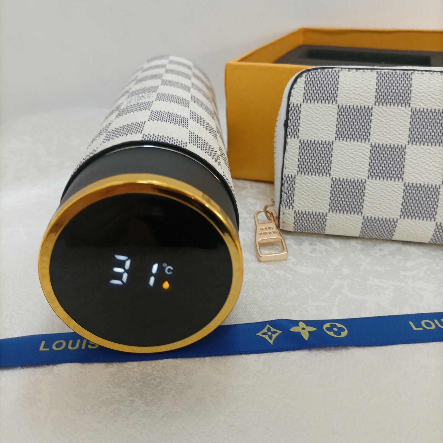 complete Louis Vuitton Damier Azur Bottle Set - The Louis Vuitton Damier Azur Bottle Set is a luxurious and stylish ensemble perfect for gifting or personal use. This set includes a high-quality stainless steel bottle adorned with the iconic Damier Azur pattern, a matching key holder, and a petite wallet, all elegantly presented in a signature Louis Vuitton box. The bottle is designed to keep your beverages hot or cold for hours, making it ideal for daily commutes, travel, or outdoor activities. The key holder and wallet add a touch of sophistication and practicality to the set, ensuring you stay organized in style. This set is a testament to Louis Vuitton's commitment to craftsmanship, quality, and timeless design, making it a valuable addition to any collection. The intricate detailing and premium materials used in this set reflect the brand's dedication to providing luxury and functionality.